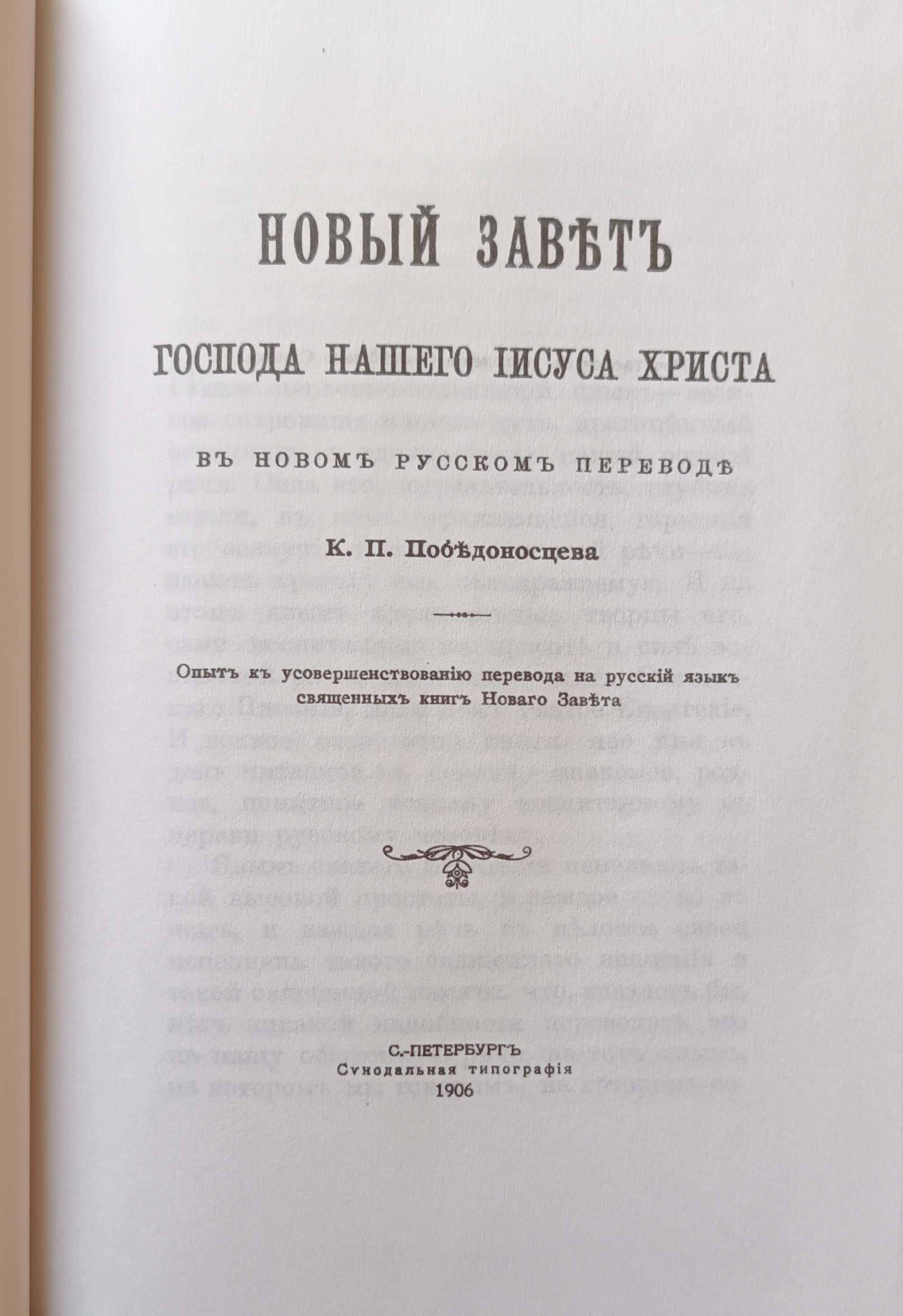 Перевод Нового Завета, выполненный обер-прокурором Святейшего Синода Константином Петровичем Победоносцевым (1827 - 1907). Репринтное воспроизведение издания 1906 г. в серии "Книги Священного Писания в русских переводах XIX - XX веков".