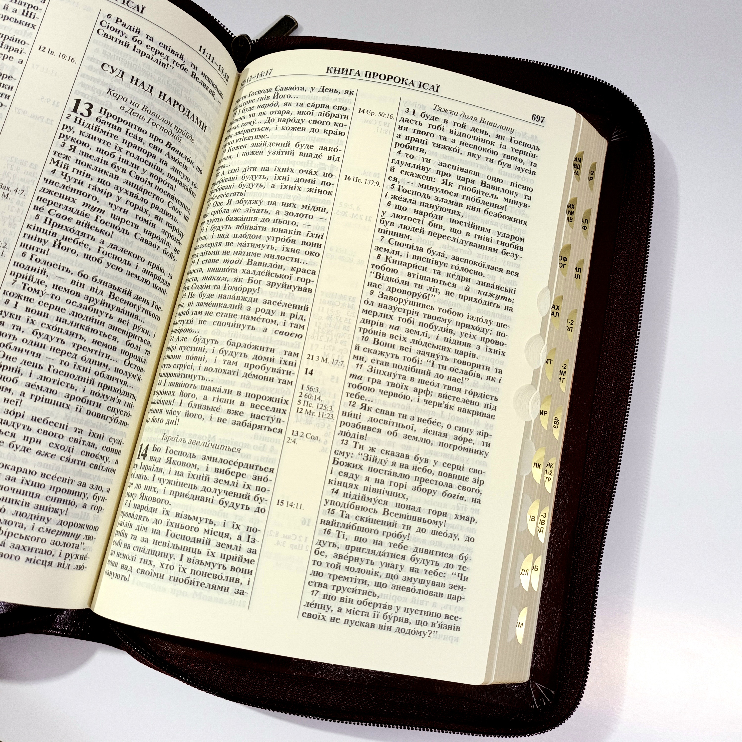 Додаткова інформація: палітурка м’яка, натур.шкіра, вказівники для пошуку біблійних книг, обріз книжкового блоку золото, стрічка-закладка, застібка-блискавка.