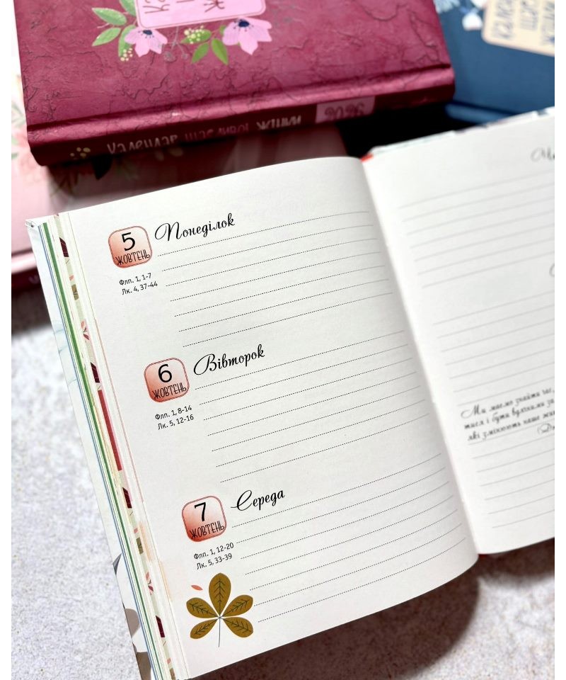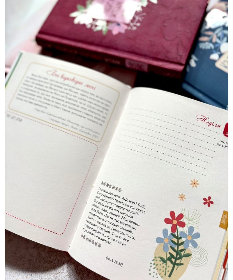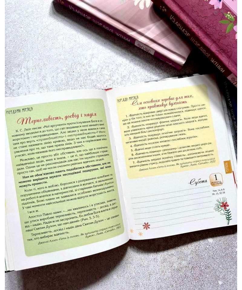 У щоденнику на 2026 рік з'явилося більше графічних зображень, незмінними залишилися цитати зі Святого Письма, кулінарні поради, короткі роздуми та молитви. У 2026 році власниць Календаря щасливої жінки супроводжуватимуть цитати Енн Воскемп із книжки “Тисяча дарів” про вдячність, яка є нашою опорою і натхненням, нашими дверима до життя у повноті.