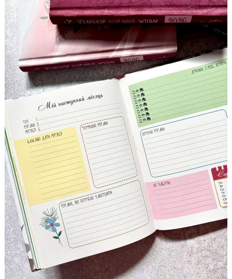Календар щасливої жінки на 2026 рік — справжній помічник для сучасної та активної особи, яка любить планувати свій час. На сторінках записника можна робити нотатки, письмово впорядковувати свої справи та вести приватні записи.