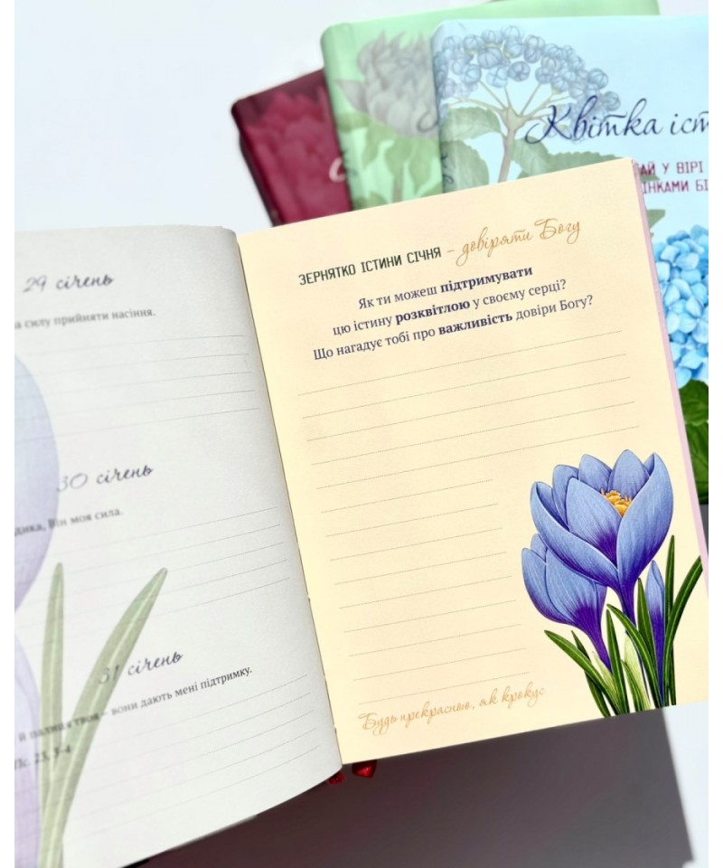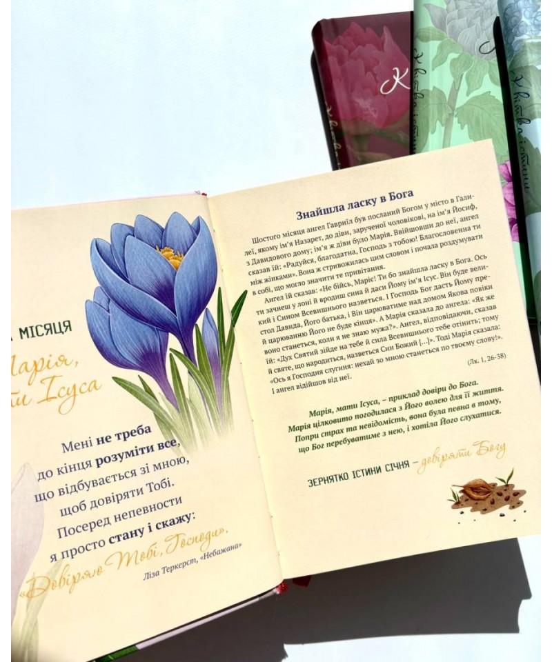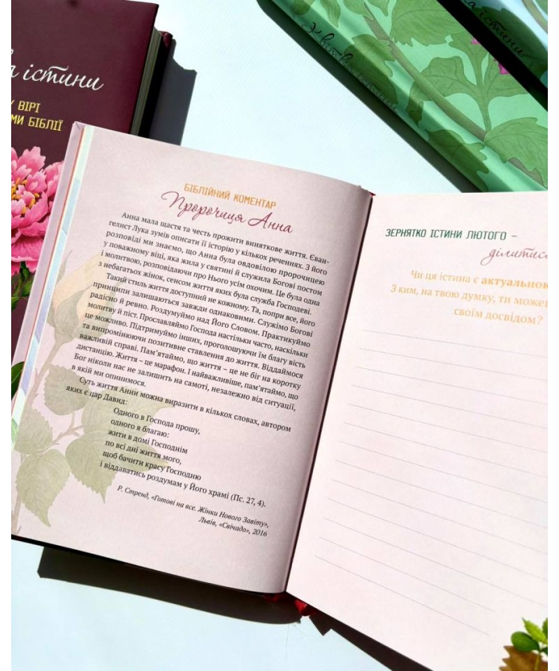 Недатований записник “Квітка істини” зацікавить жінок, які хочуть поглибити свої знання Біблії. Він базується на 12 історіях біблійних жінок, кожна з яких надихає і стверджує у вірі. Їхній приклад допоможе розпізнати Божу волю, подолати життєві труднощі, довіритися Богові у молитві та у щоденному житті. Чому “Квітка істини”? Бо ваша віра буде рости і розвиватися кожен день, як квітка, процес зростання якої зафіксувала художниця Юлія Щирба.