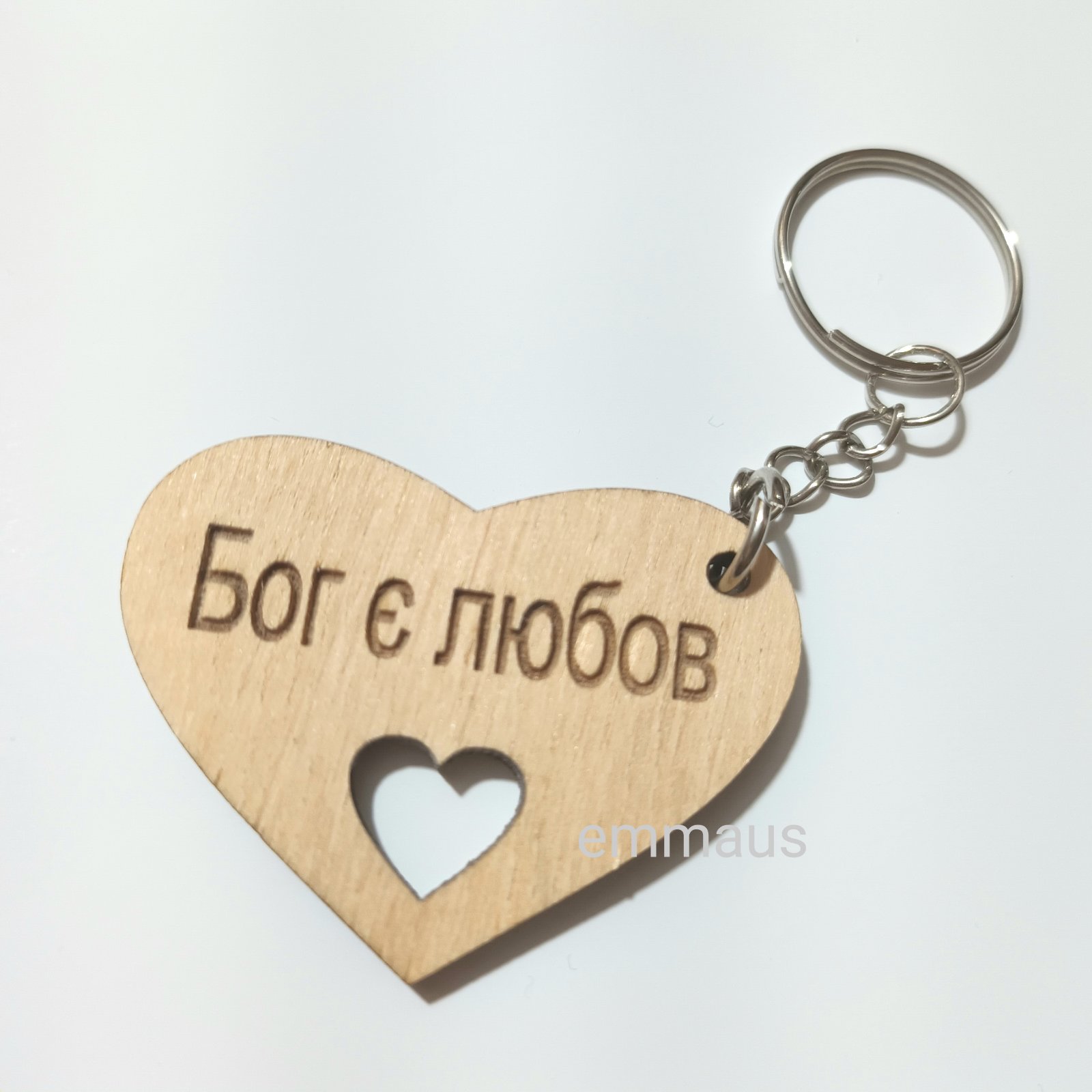 Еко-брелок із дерева на ланцюжку з кільцем. Форма серце. Текст українською мовою.