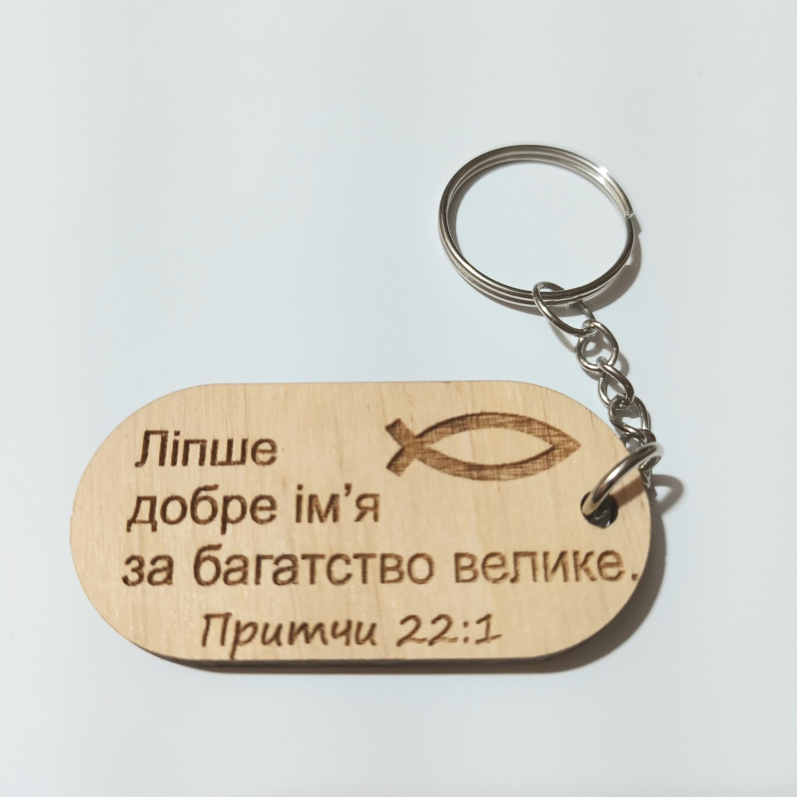 Еко-брелок із дерева на ланцюжку з кільцем. Форма овал. Текст українською мовою: "Ліпше добре ім'я за багатство велике".