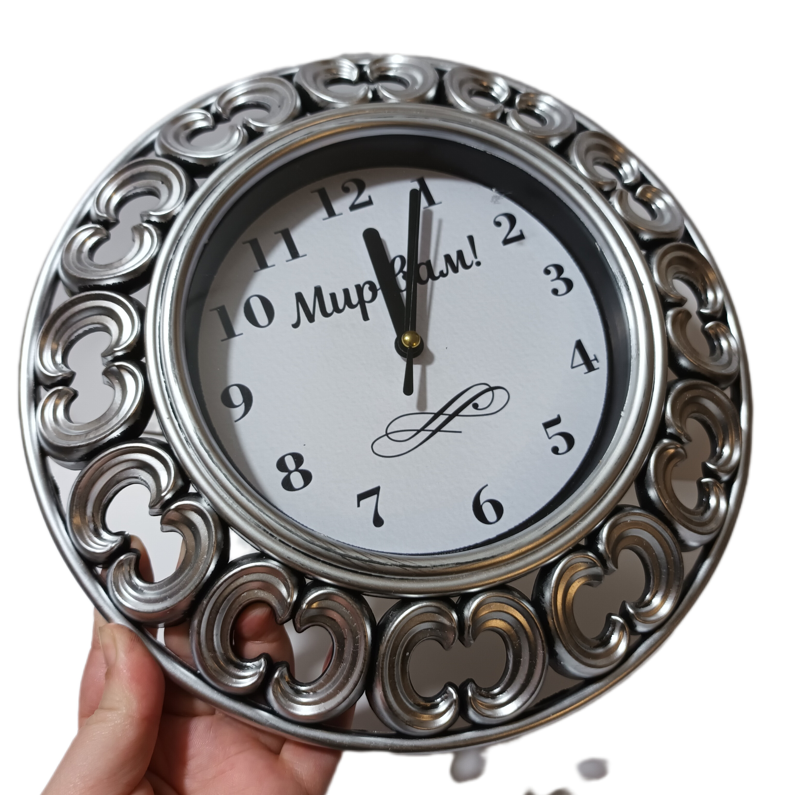 Product Summary Годинник з написом Мир вам! Механізм плаваючий, безшумний. Діаметр 25см. Батарейки в комплекті немає.