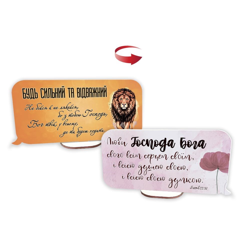 Декоративні дерев'яні таблички з мотивуючими написами та цитатами з Біблії - хороший подарунок та прикраса для дому. Матеріал - дерево, МДФ. Комплектуючі - табличка, підставка. Загальний розмір таблички - 20х10 см. Ширина підставки - 6,5 см.