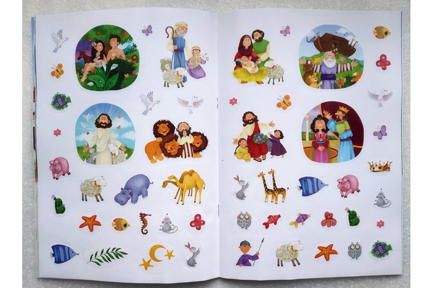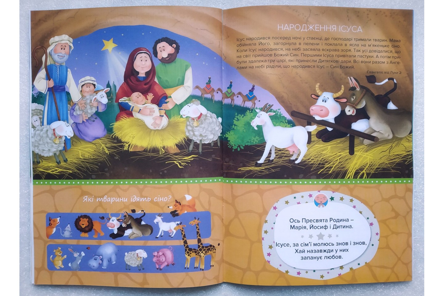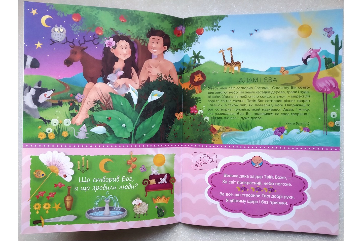 До вибраних історій з Біблії увійшли оповідки про Ноя і ковчег, Давида і Голіята, Різдво Христове, тощо. До кожної з історій додане завдання – ребус, загадка, коротка віршована молитва і наліпки.