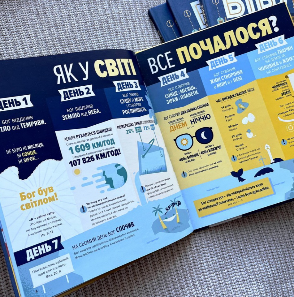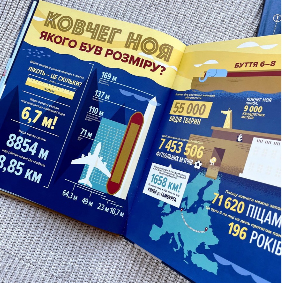 «Біблія в інфографіці для дітей» – це перша книжка такого формату від видавництва «Свічадо». Задум авторів геніальний і водночас простий: розповісти дітям про важливі біблійні події так, щоб їх було легше зрозуміти і навіть уявити. Інфографіка пригодилася у цій справі якнайкраще.