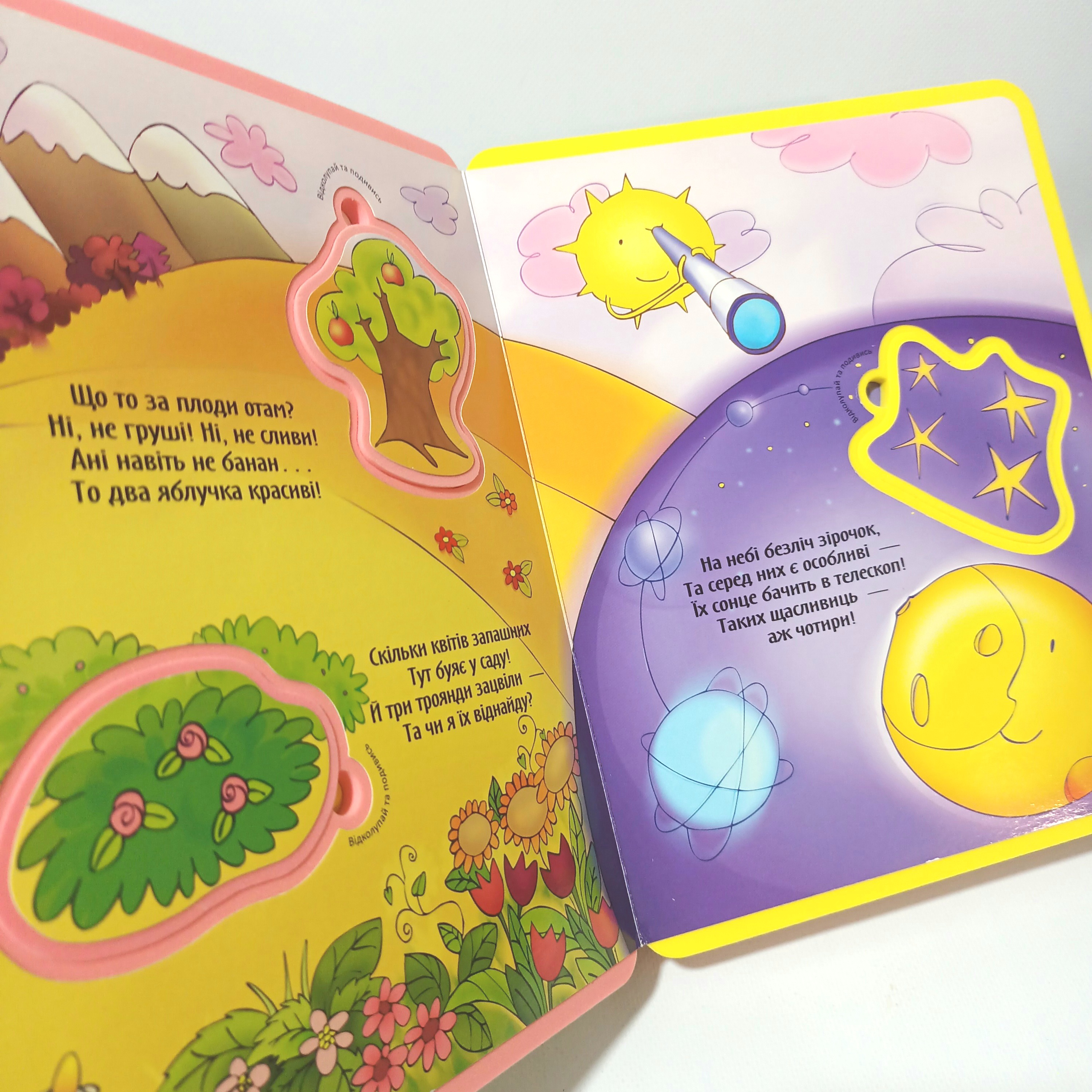 М’які сторінки допоможуть дітям досліджувати все самостійно, а кумедні віршики спонукатимуть малят доторкатися до сторінок пальчиками та виймати фігурні деталі. Сонце, зірки, планети, пташки, риби та різноманітні тварини у поєднанні з цифрами допоможуть дітям навчитись рахувати та поповнять словниковий запас.