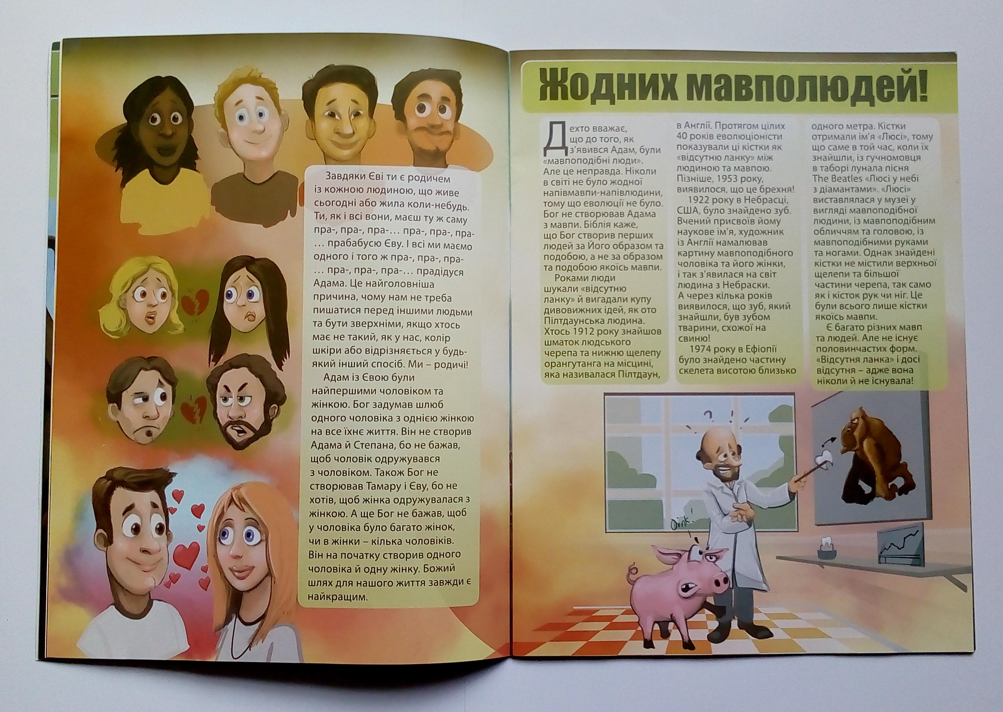 Тобі, можливо, доводилося чути, що, мовляв, люди походять від мавп. Але це неправда. Адам і Єва походили не від мавп. Їх обох створив Бог, спочатку Адама, а потім - Єву. Вони утворили першу в світі сім′ю, і кожен, хто коли-небудь жив на Землі, походить від них.