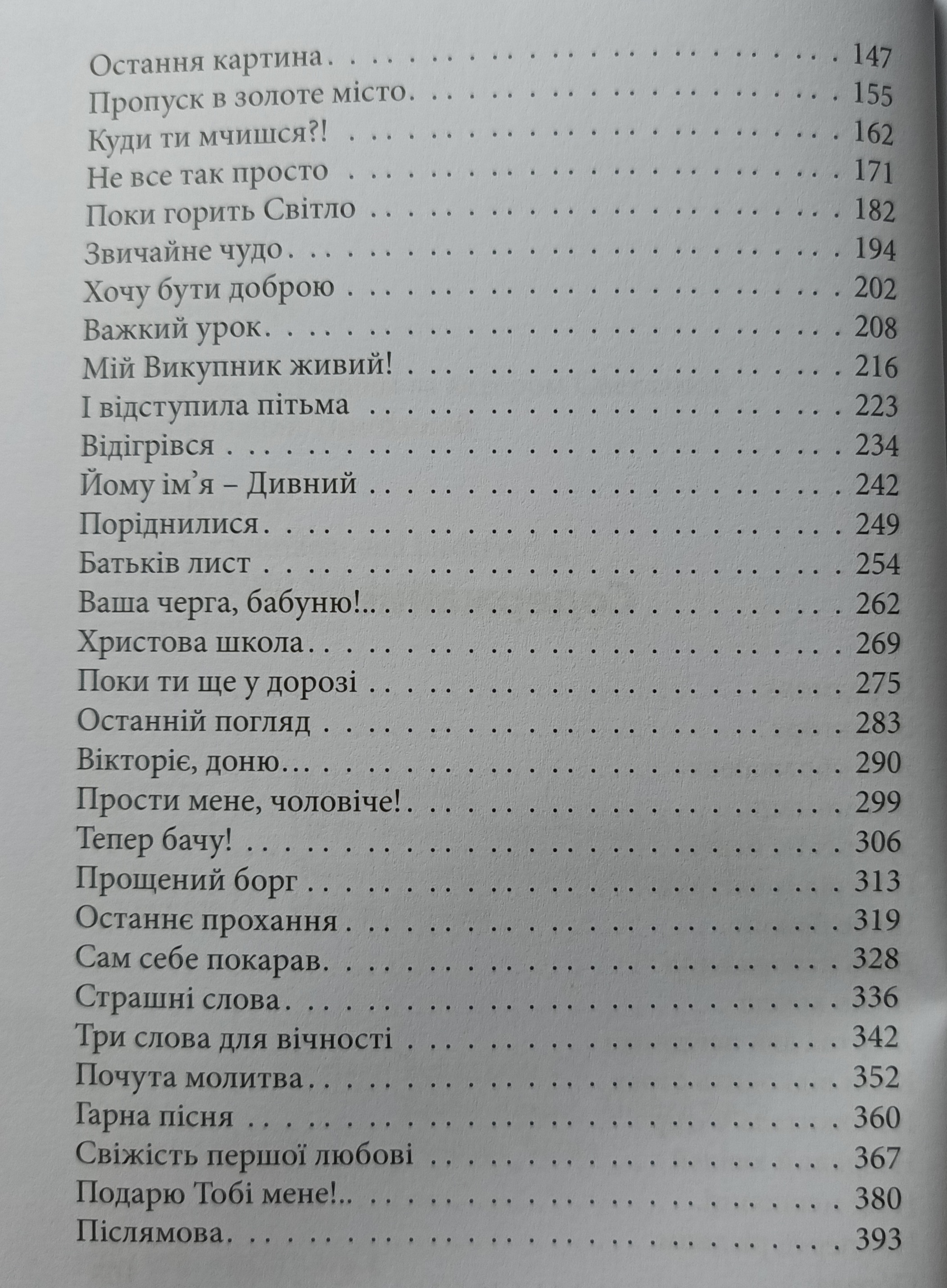 Збірник оповідань “Прощений борг”, про тих, хто пережив щастя звільнення від усвідомлення провини перед Богом, що терзає душу. Всі розповіді правдиві та засновані на реальних подіях. Розповіді короткі та читаються на одному диханні, залишаючи після себе досвід прилучення до прийняття Христа. Немає для Нього надто високих людей, яких Він не міг би досягти: наприклад, доктор Тимчук з розповіді “Викупитель мій живий” або Павло Васильович із розповіді “Сам себе покарав”.