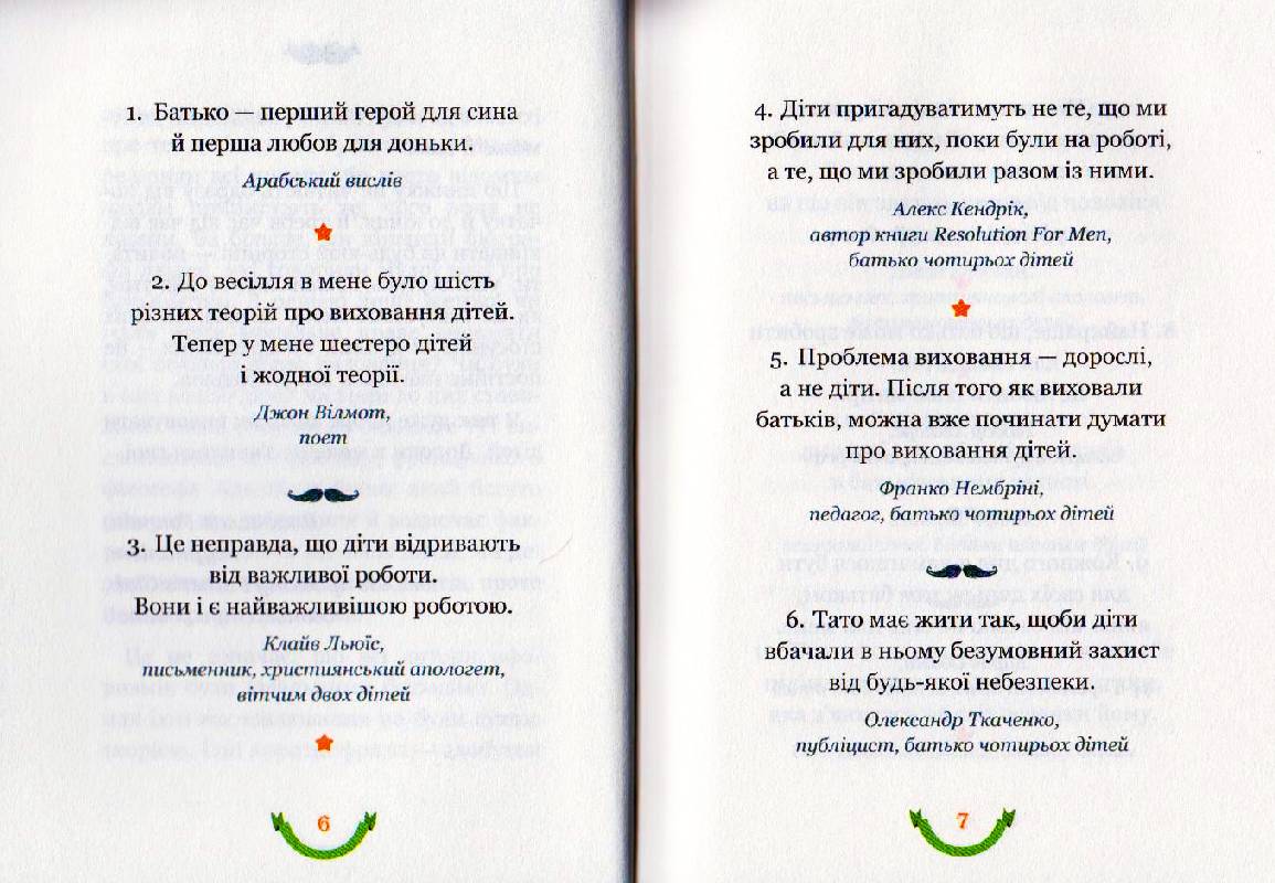 У кожного телефона має бути підзарядка, у кожного з батьків — така книжка, яка виконує подібні функції. Відкриваєте її на будь-якій сторінці, читаєте кілька висловів — і вже відчуваєте нові емоції: або ви усміхнулися, або замислилися, або пригадали, що треба зателефонувати дитині, чи пограти з нею, чи допомогти їй у чомусь. Або раптом зрозумієте, як саме треба поводити себе в ситуації, в якій тепер опинилися. У будь-якому разі від цієї книжки виграють усі — і батьки і діти. Бо саме для цього ми зібрали ці вислови — не просто банальні твердження про те, як важливо бути батьком чи приділяти дітям час. А найважливіше з досвіду сотень класних батьків зі всіх країн, континентів, за всіх часів та епох. Ця книжка — сконцентрована мудрість з усіх тисячоліть та з усієї планети.