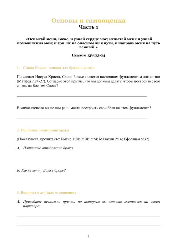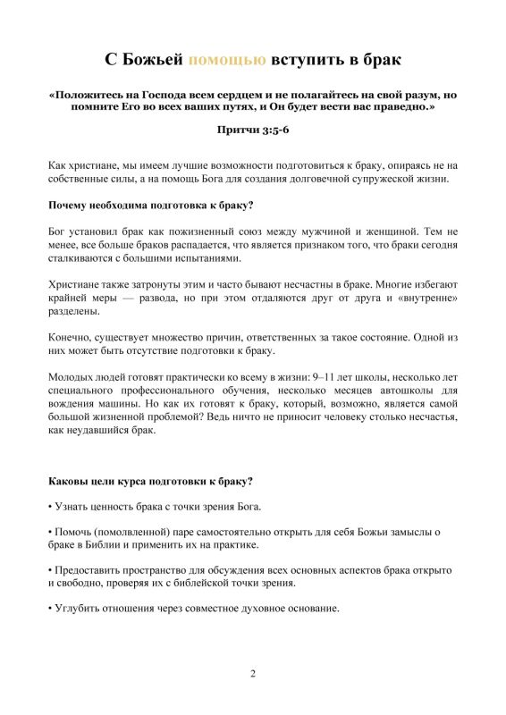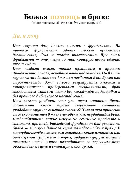 Закласти міцний, біблійний фундамент для успішного шлюбу – це мета цього курсу підготовки до шлюбу. У співпраці з досвідченим сімейним консультантом або більш зрілою подружньою парою, майбутнє подружжя може за допомогою цього курсу розробити та переосмислити божественні цілі та стандарти для шлюбу.
