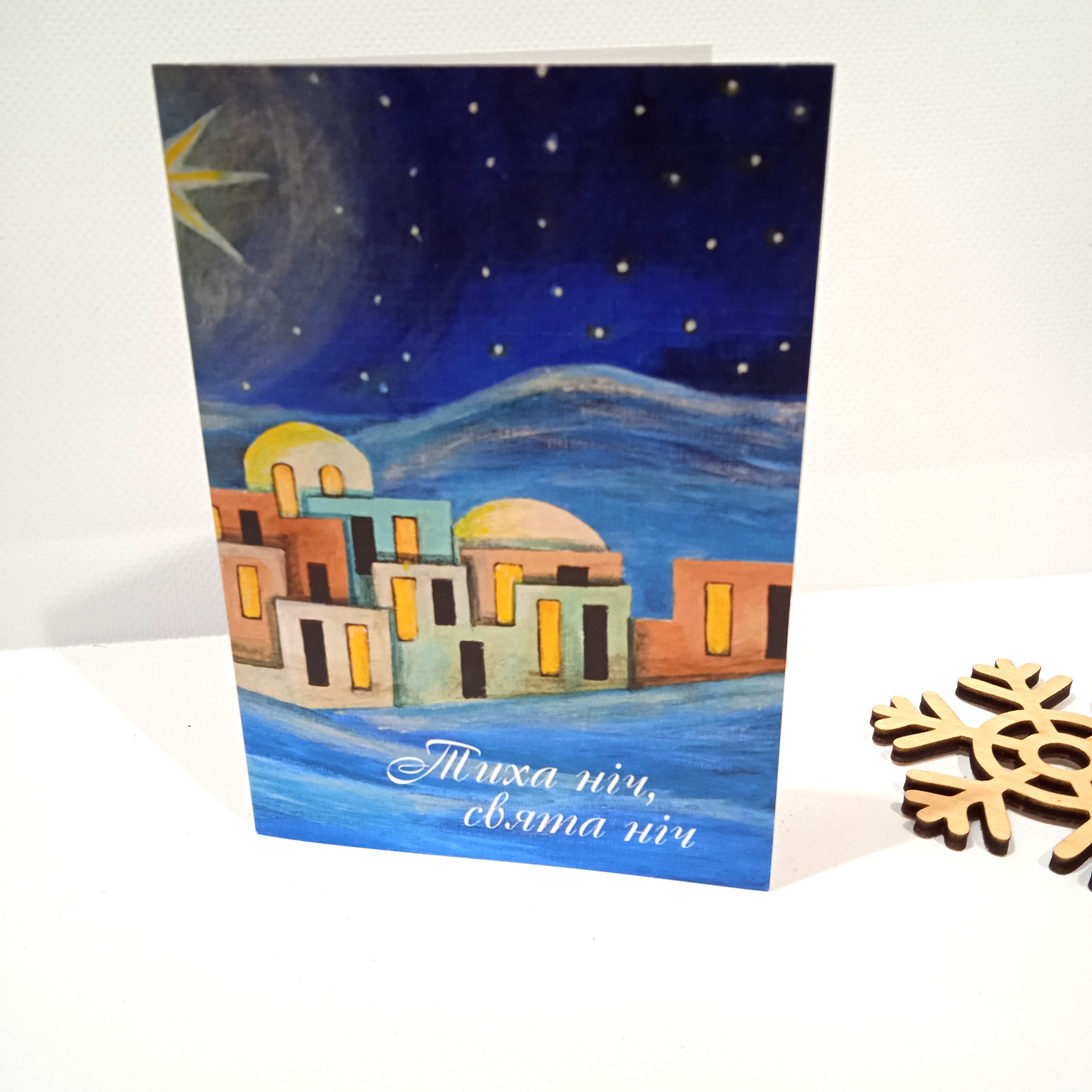 Тематична різдвяна листівка українською мовою. Подвійна. Текст в середині: "У цей особливий та піднесений час бажаю в тиші поміркувати про Велич та диво Різдва та подякувати Богу за народження Спасителя". Розмір в складеному вигляді 105х150мм.