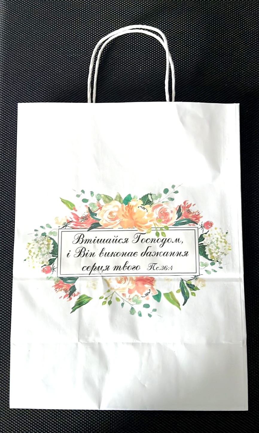 Product Summary Паперові Еко-пакетики - новинка в нашому асортименті. Білі крафтові пакетики з ручкою. З однієї сторони дуже гарний квітковий принт з текстом: "ВТІШАЙСЯ ГОСПОДОМ і Він виконає бажання серця твого". Розмір 26х35х15см.