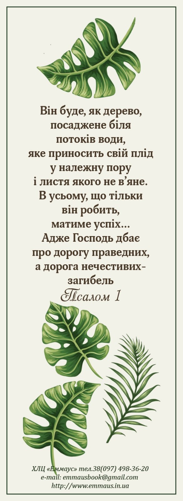 Закладка кольорова, з обох сторін малюнок та біблійний текст. Напис українською мовою. Розмір 150х55мм. Матеріал: картон гнучкий.
