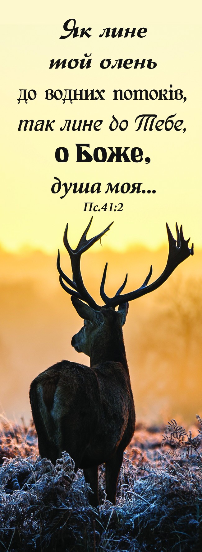 Закладка картонна. Зворотня сторона без тексту, можна використовувати для нотаток. Загальний розмір 150х54 мм. Текст українською мовою. Біблійні вірші взяті з Біблії