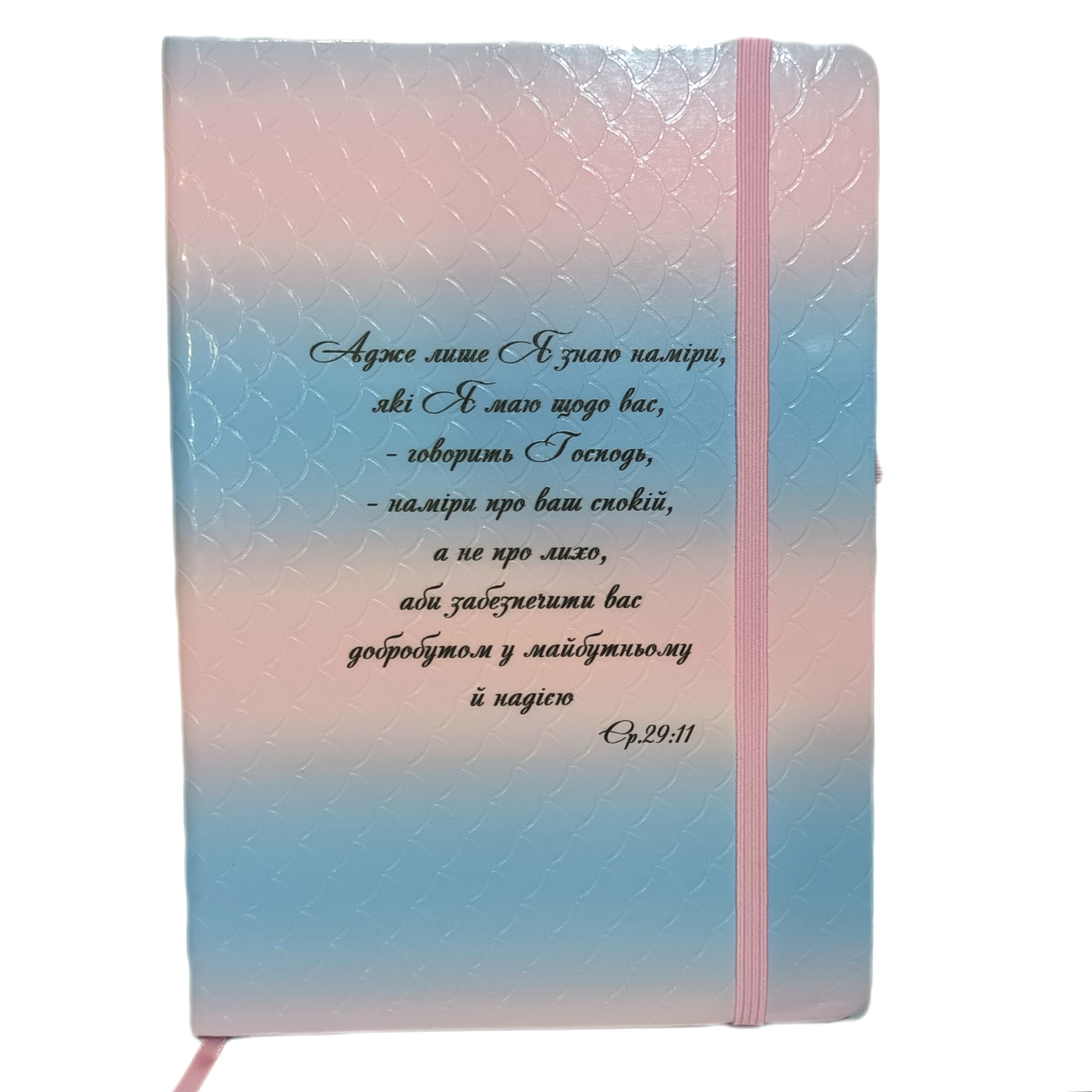 Записник з біблійним текстом "Алже лише Я знаю наміри, які маю про вас - говорить Господь, наміри про ваш спокій, а не про лихо, аби забезпечити вас добробутом у майбутньому і надією" Обкладинка тверда, глянцева. Колір комбінований. Паперовий блок в клітинку. Має стрічку-закладку. Боковий зріз профарбований. Збоку резинка для фіксації кулькової ручки.