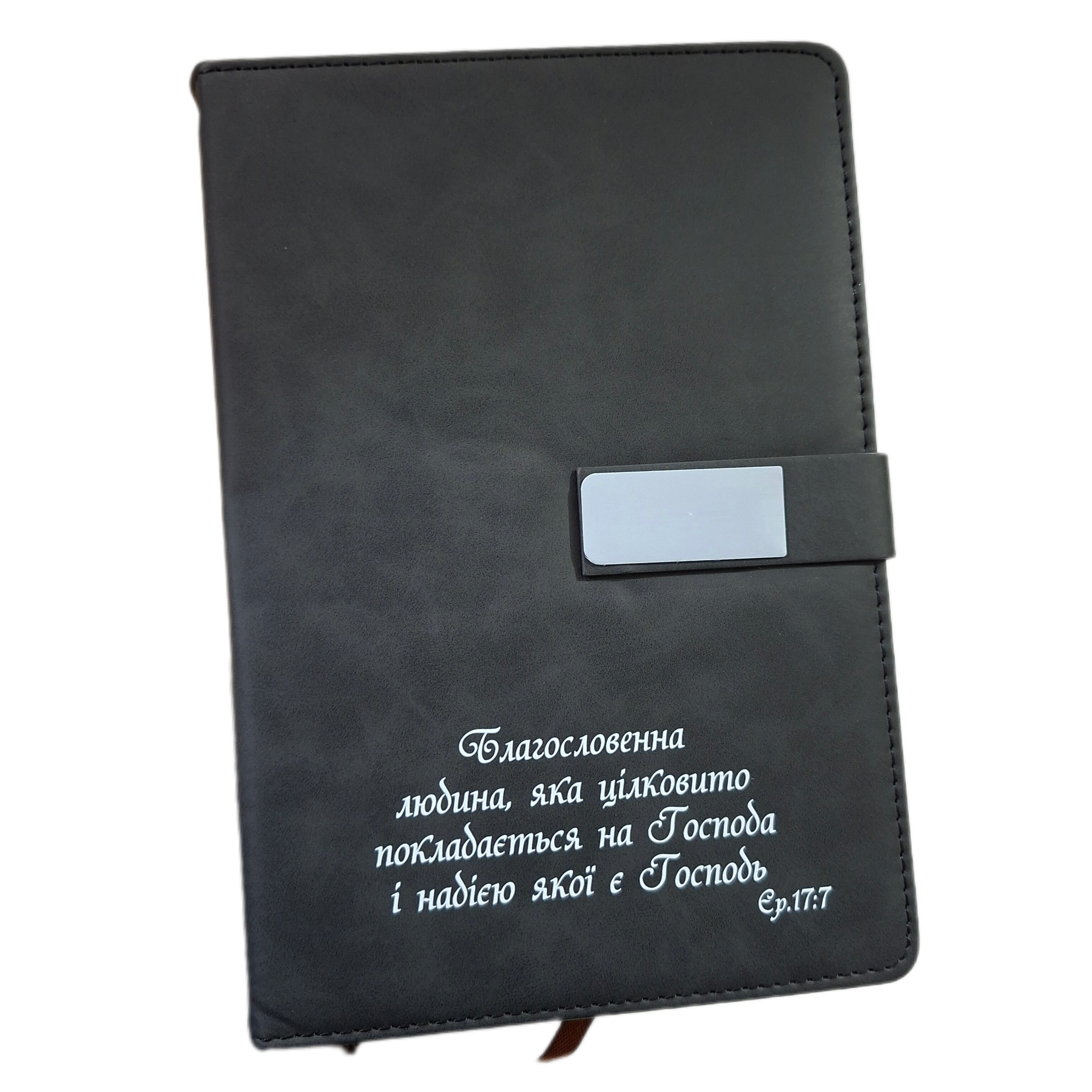 Діловий записник з біблійним текстом: "Благословенна людина, яка цілковито покладається на Господа і надією якої є Господь".
