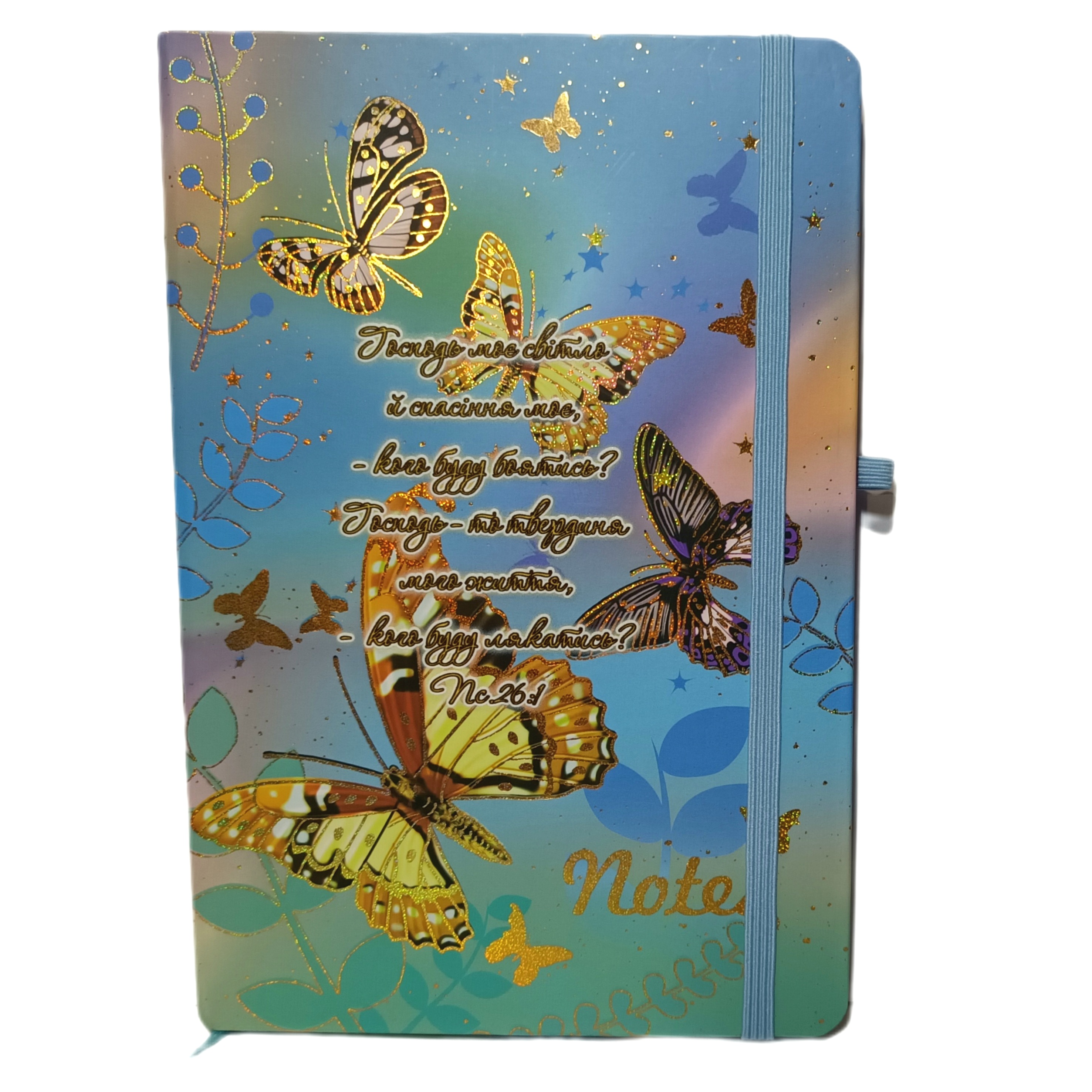 Записник з біблійним текстом "Господь моє світлоі спасіння моє - кого буду боятись? Господь - то твердиня мого життя - кого буду лякатись". Формат А5. Обкладинка тверда. Колір блакитний з метеликами. Паперовий блок в клітинку. Має стрічку-закладку. Збоку резинка для фіксації кулькової ручки.
