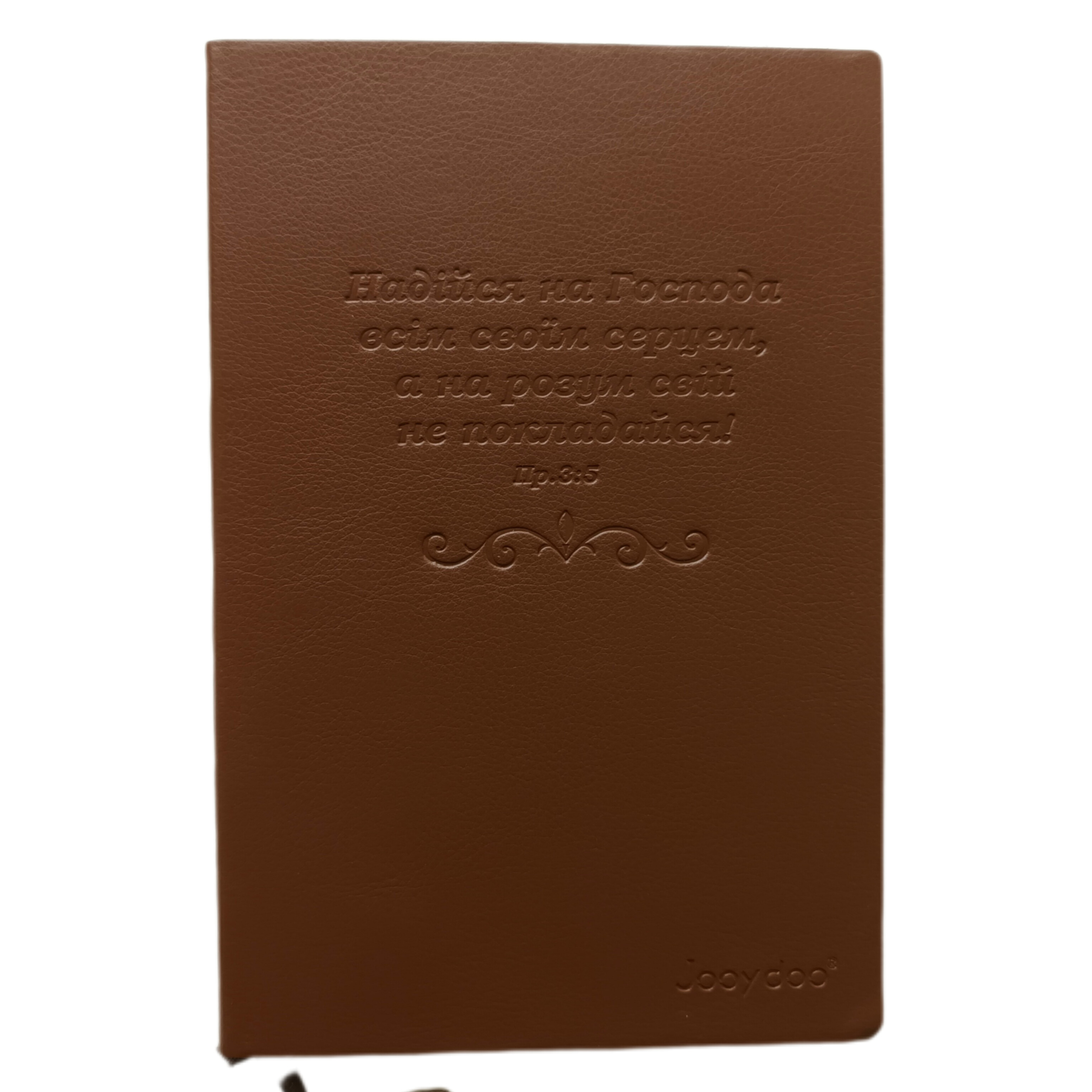 Записник в гнучкій обадинці коричневого кольору, мотова поверхня. Текст на обкладинці українською мовою. Паперовий блок в клітинку. Тонування паперу жовте. Стрічка-закладка декорована на кінці металевою пластиною. Формат 14х21мм.