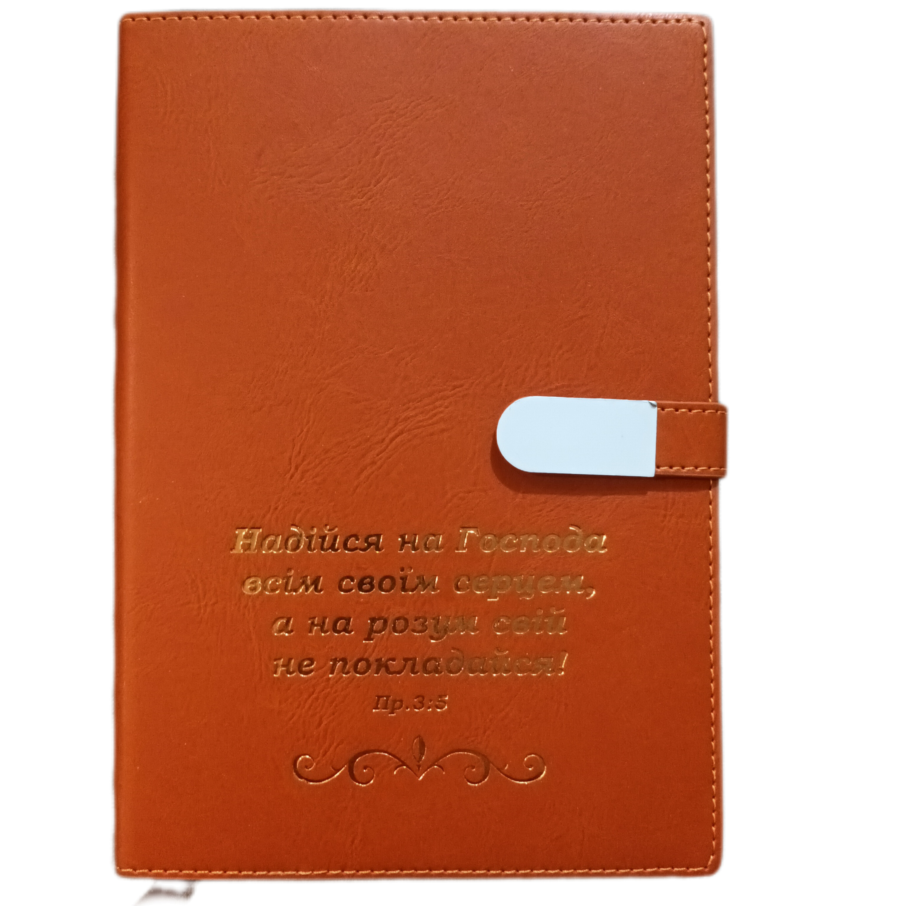 Записник в коричневій гнучкій обкладинці. Замінник шкіри. Обкладинка фіксується магнітною застібкою. Паперовий блок в клітинку. Має стрічку-закладку. Текст на обкладинці українською мовою. Розмір 145х210мм.