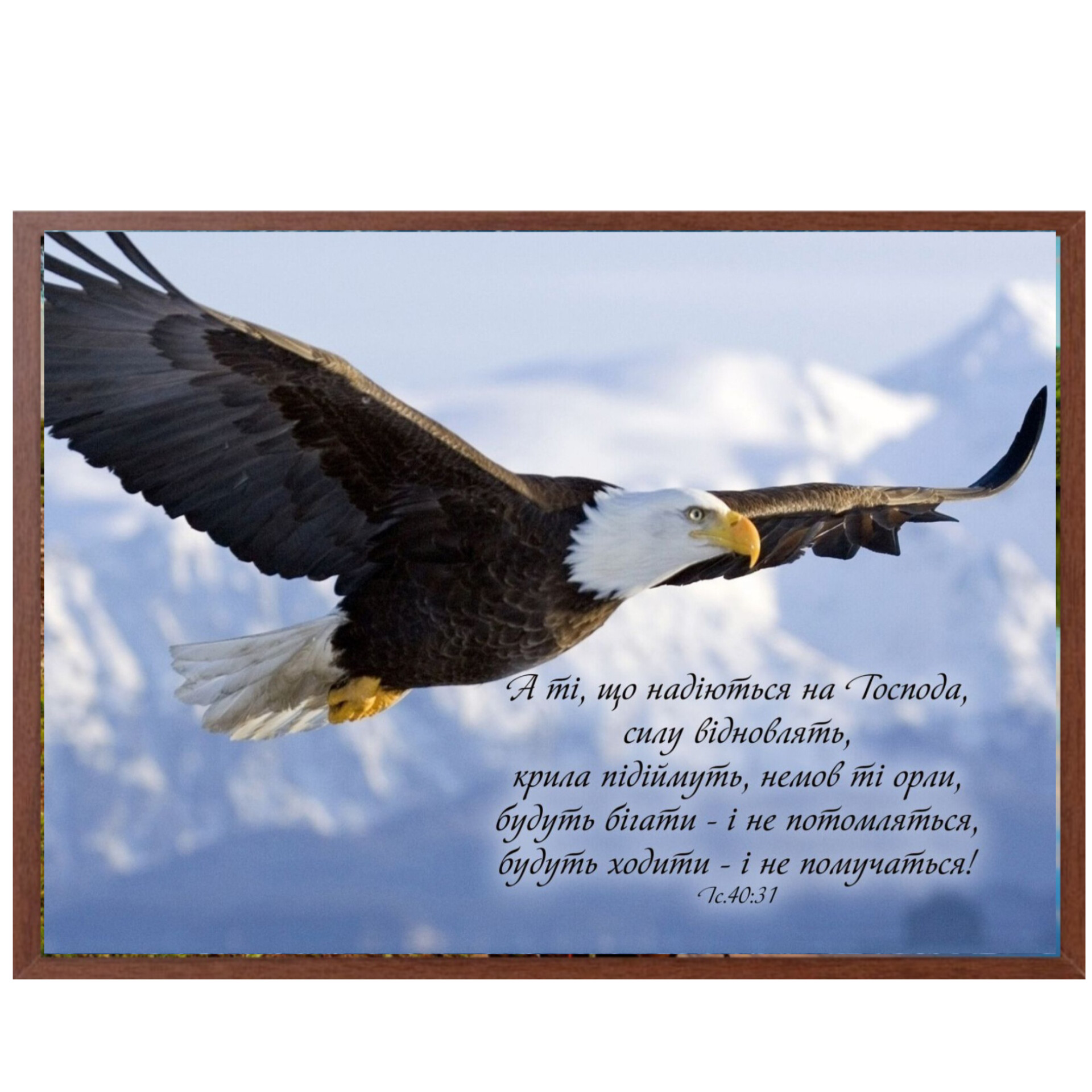 Product Summary Картина формату А4 (32х22 см). Яскравий малюнок з біблійним текстом: Книга пророка Ісаї 40:31. Рамка може відрізнятися в залежності від партії. Українською мовою.