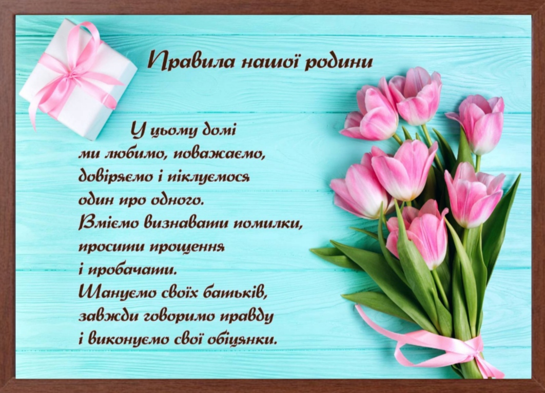 У ЦЬОМУ ДОМІ МИ ЛЮБИМО, ПОВАЖАЄМО, ДОВІРЯЄМО І ПІКЛУЄМОСЯ ОДИН ПРО ОДНОГО. ВМІЄМО ВИЗНАВАТИ ПОМИЛКИ, ПРОСИТИ ПРОЩЕННЯ І ПРОБАЧАТИ. ШАНУЄМО СВОЇХ БАТЬКІВ, ЗАВЖДИ ГОВОРИМО ПРАВДУ І ВИКОНУЄМО СВОЇ ОБІЦЯНКИ.