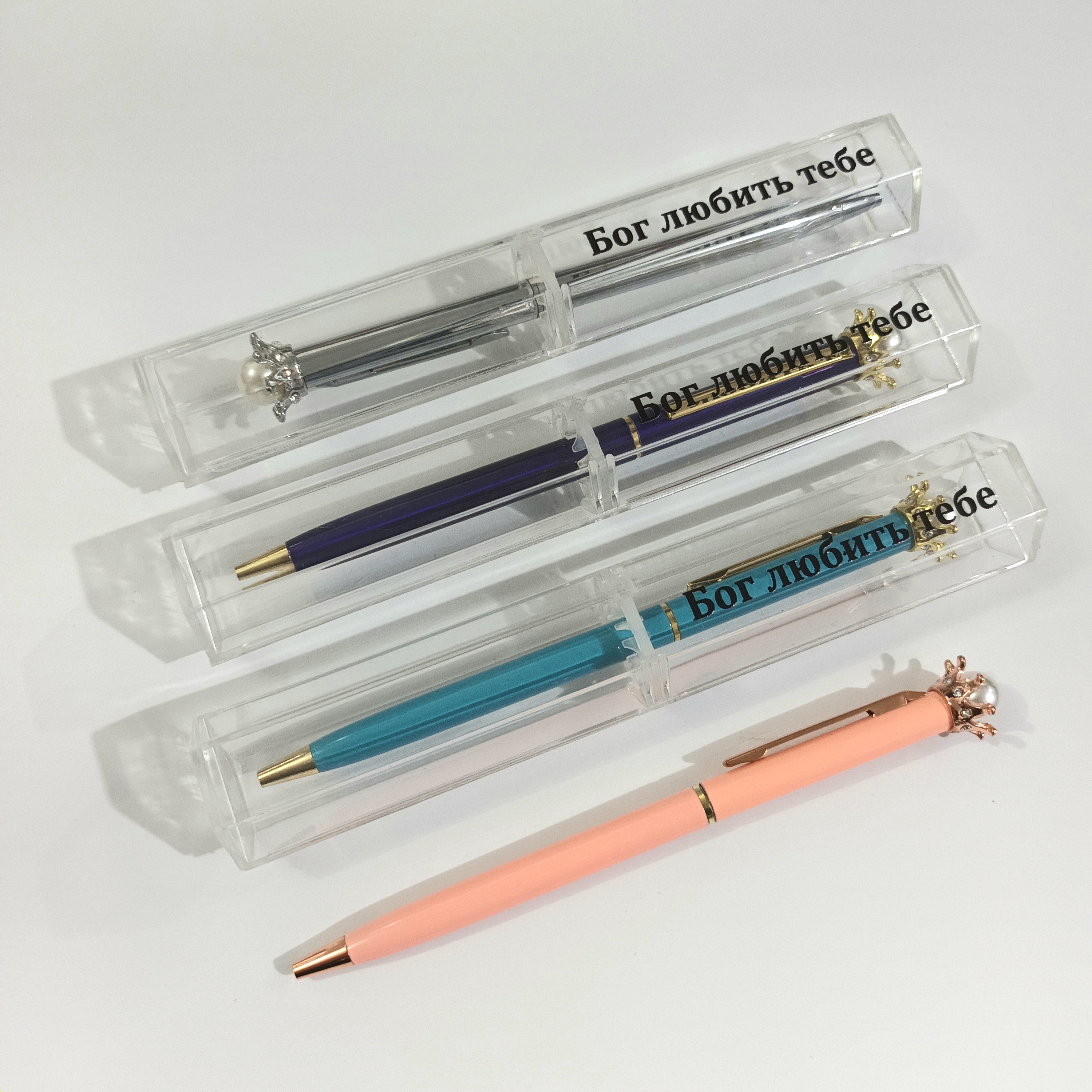 Кулькова ручка-викрутка у футлярі. Напис на футлярі: Бог любить тебе. Колір корпуса: золото, срібло, фіолет, пудра, блакитний. Глянець. На кінці корона декорована перлиною. Колір пасти синій.