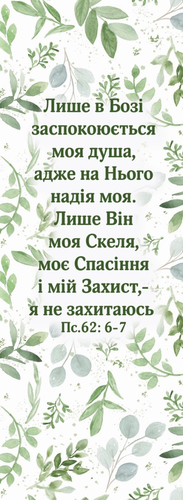 Закладка кольорова, з однієї сторіни малюнок та біблійний текст. Напис українською мовою. Розмір 150х55мм. Матеріал: картон гнучкий.