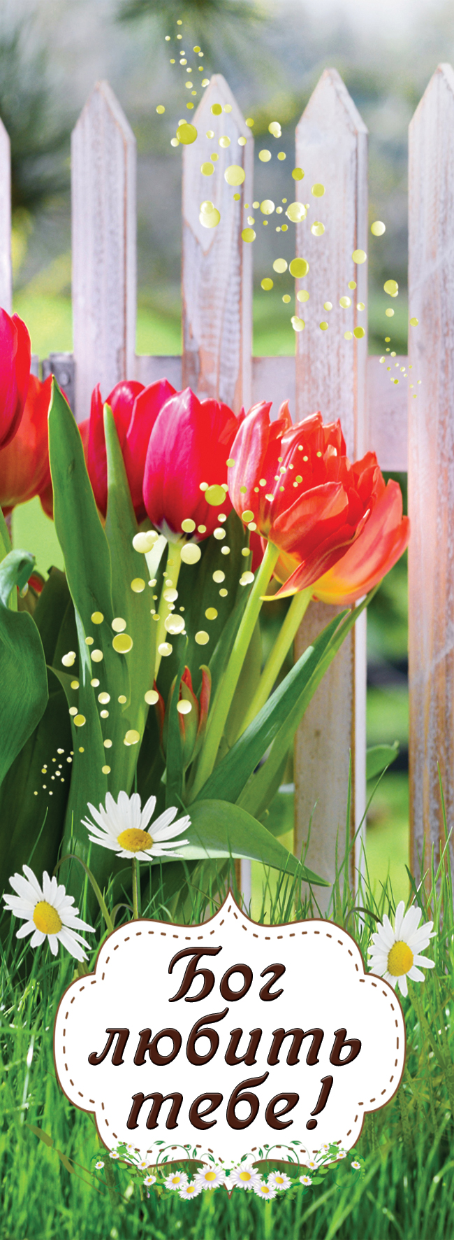 Закладка картонна. Зворотня сторона без тексту, можна використовувати для нотаток. Загальний розмір 150х54 мм. Текст українською мовою. Підбадьорюючий текст на закладці: Бог любить тебе.