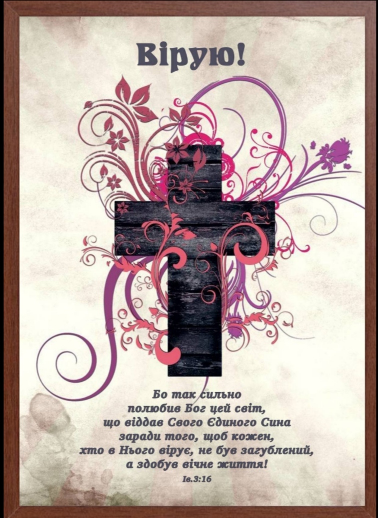 Картина формату А4. Текст можна редагувати: добавити дату, від кого і для кого... та інше. "ВІРУЮ! Бо так сильно Бог полюбив цей світ, що віддав Сина свого Єдиного, заради того, щоб кожен, хто в Нього вірує, не був загублений, але здобув життя вічне". Мова українська. Положення: на стіну.