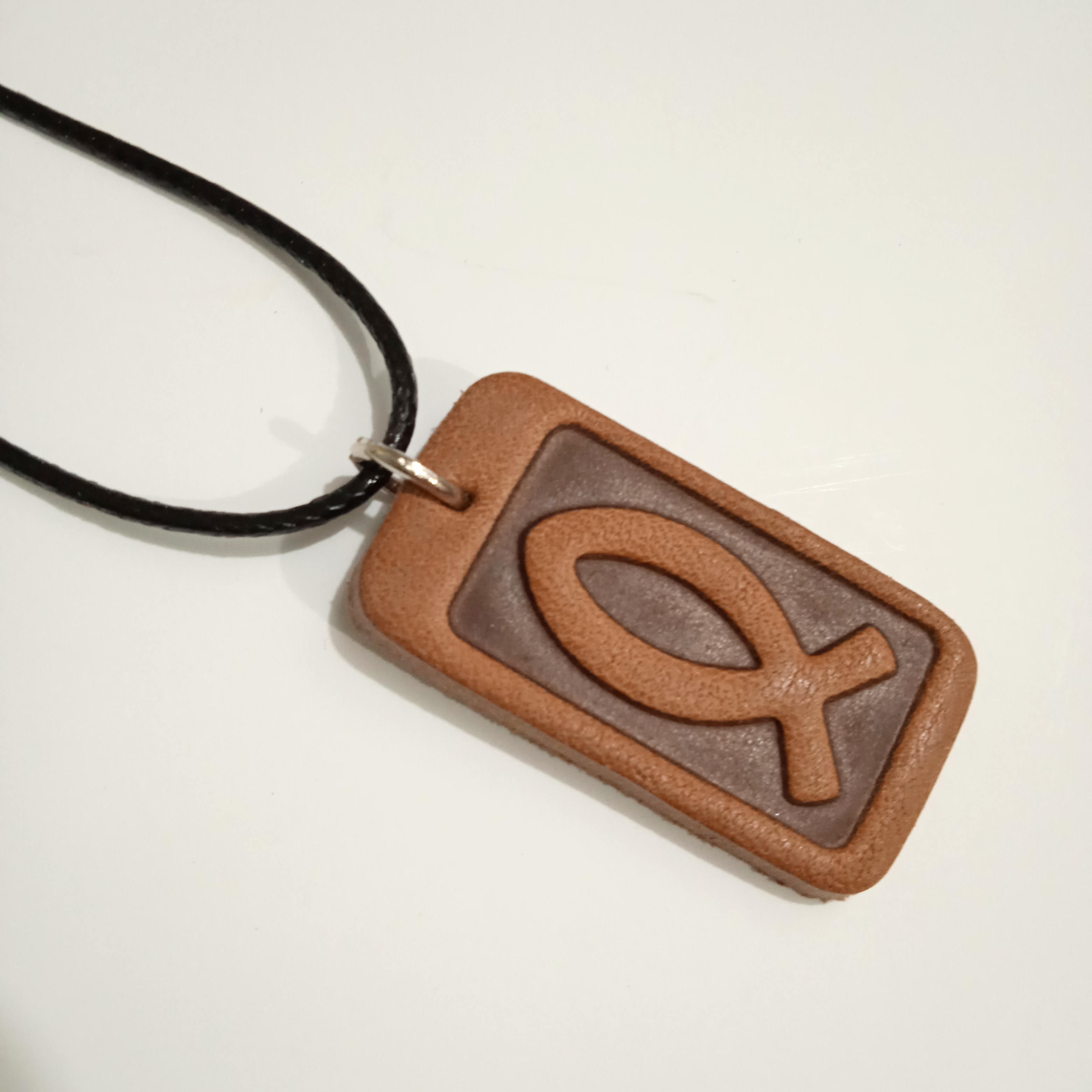 Підвіска із натуральної шкіри. Розмір 4х2см. Довжина ланцюжка 42см, зроблений із шкіри, чоного кольору. Металева застібка. Напис: рибка.