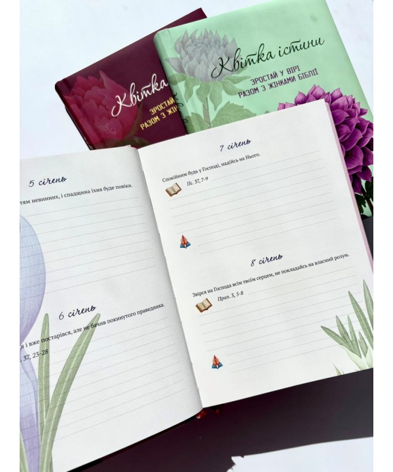 Недатований записник “Квітка істини” зацікавить жінок, які хочуть поглибити свої знання Біблії. Він базується на 12 історіях біблійних жінок, кожна з яких надихає і стверджує у вірі. Їхній приклад допоможе розпізнати Божу волю, подолати життєві труднощі, довіритися Богові у молитві та у щоденному житті. Чому “Квітка істини”? Бо ваша віра буде рости і розвиватися кожен день, як квітка, процес зростання якої зафіксувала художниця Юлія Щирба.