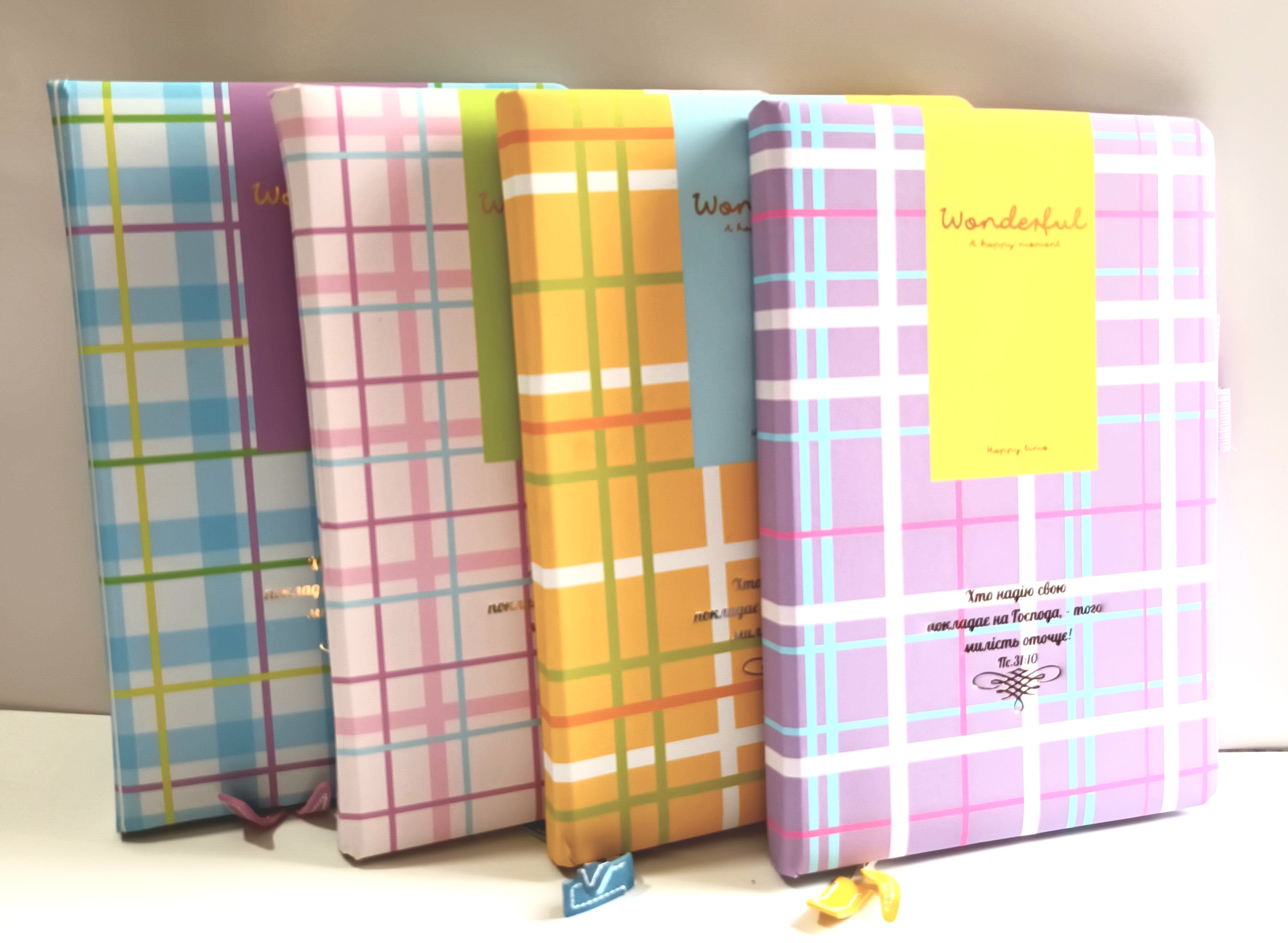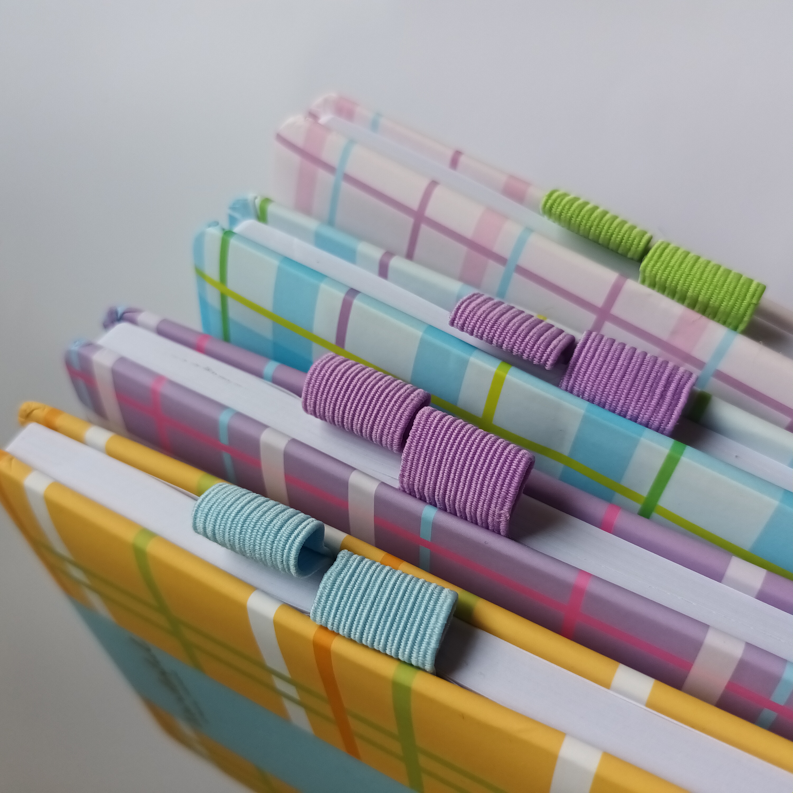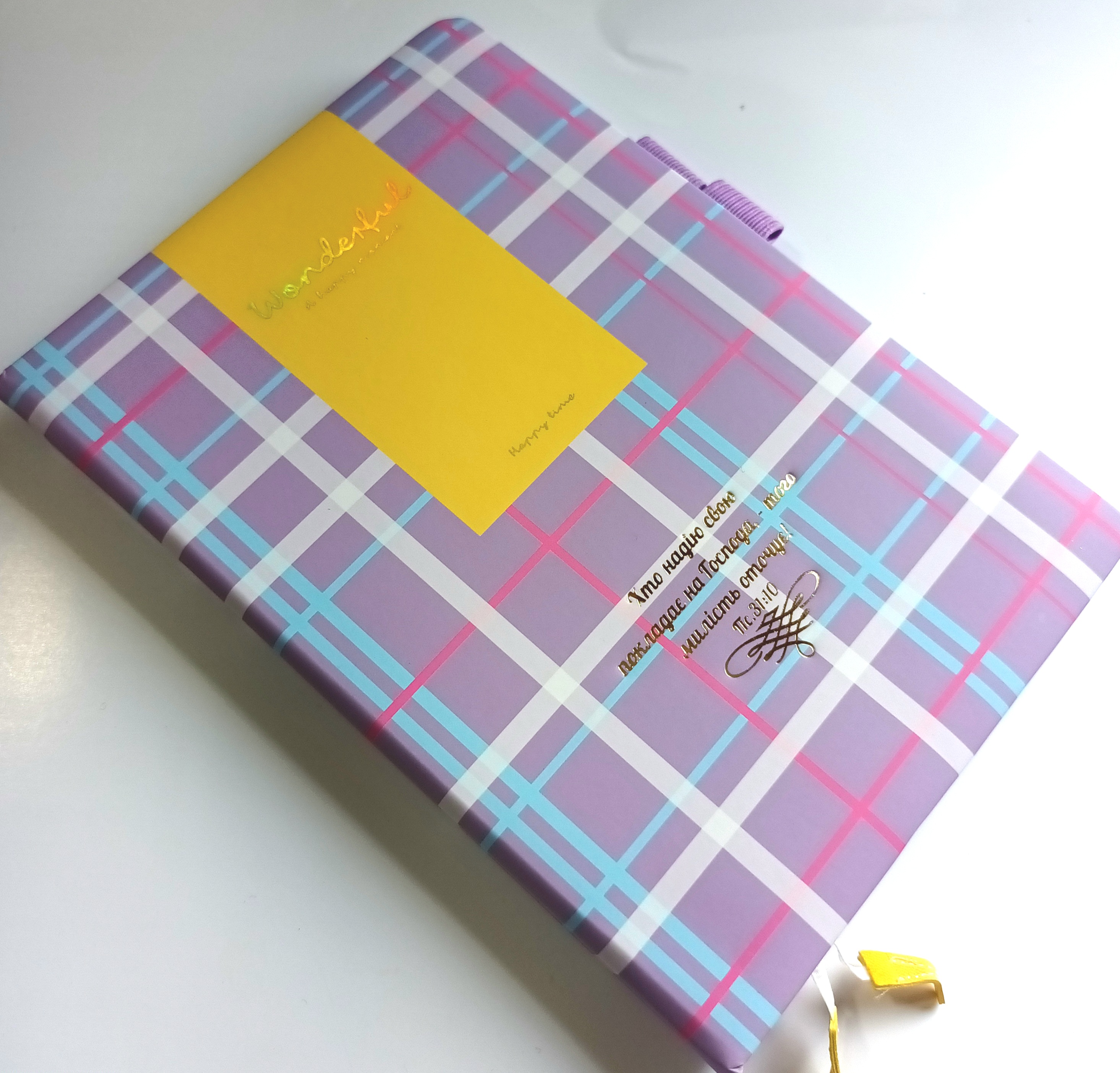 Записник з твердою набутою обкладинкою. Переважно фіолетовий колір. Принт: клітинка.