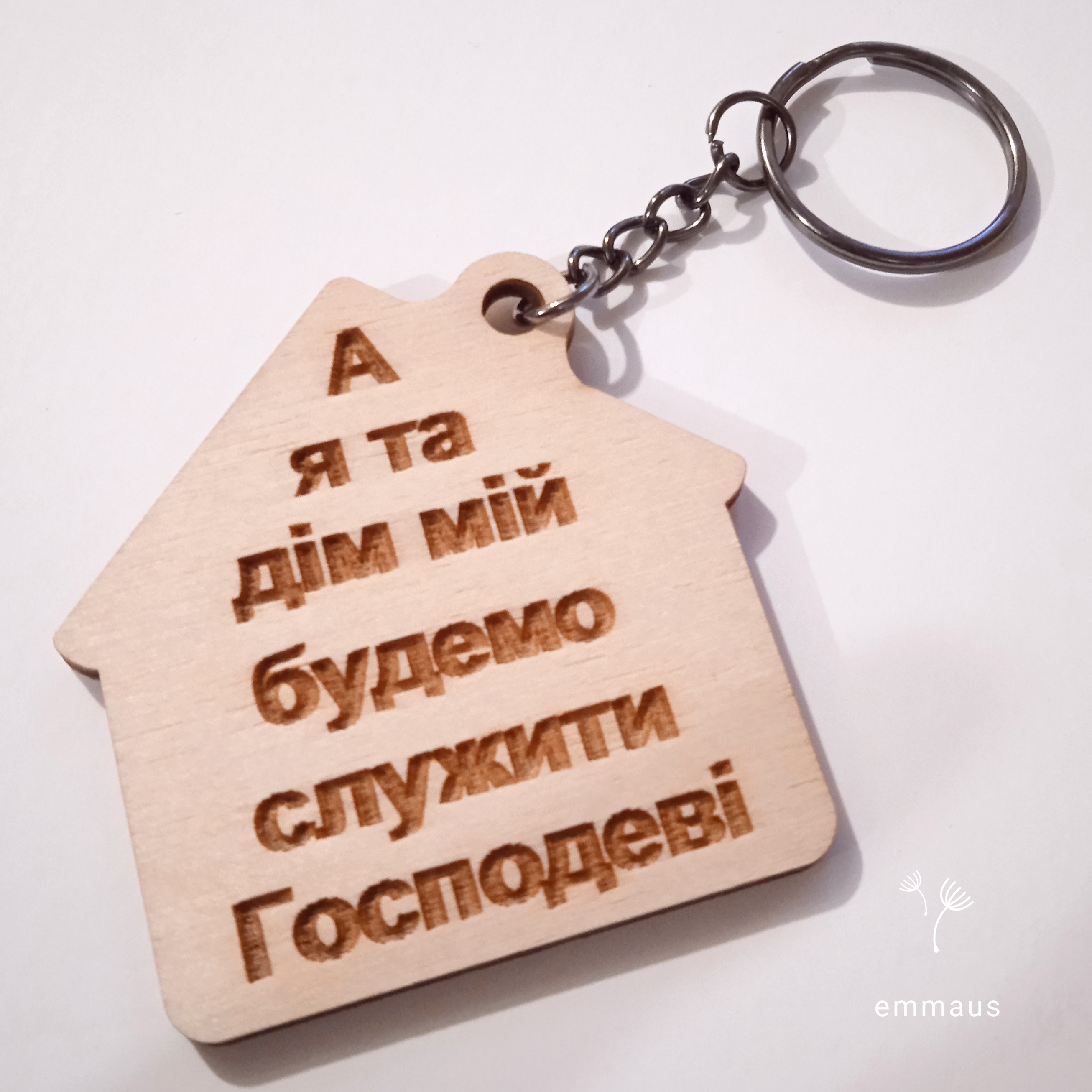 Product Summary Еко-брелок із дерева на ланцюжку з кільцем. Форма будиночка. Текст українською мовою: "А я та дім мій будемо служити Господеві".