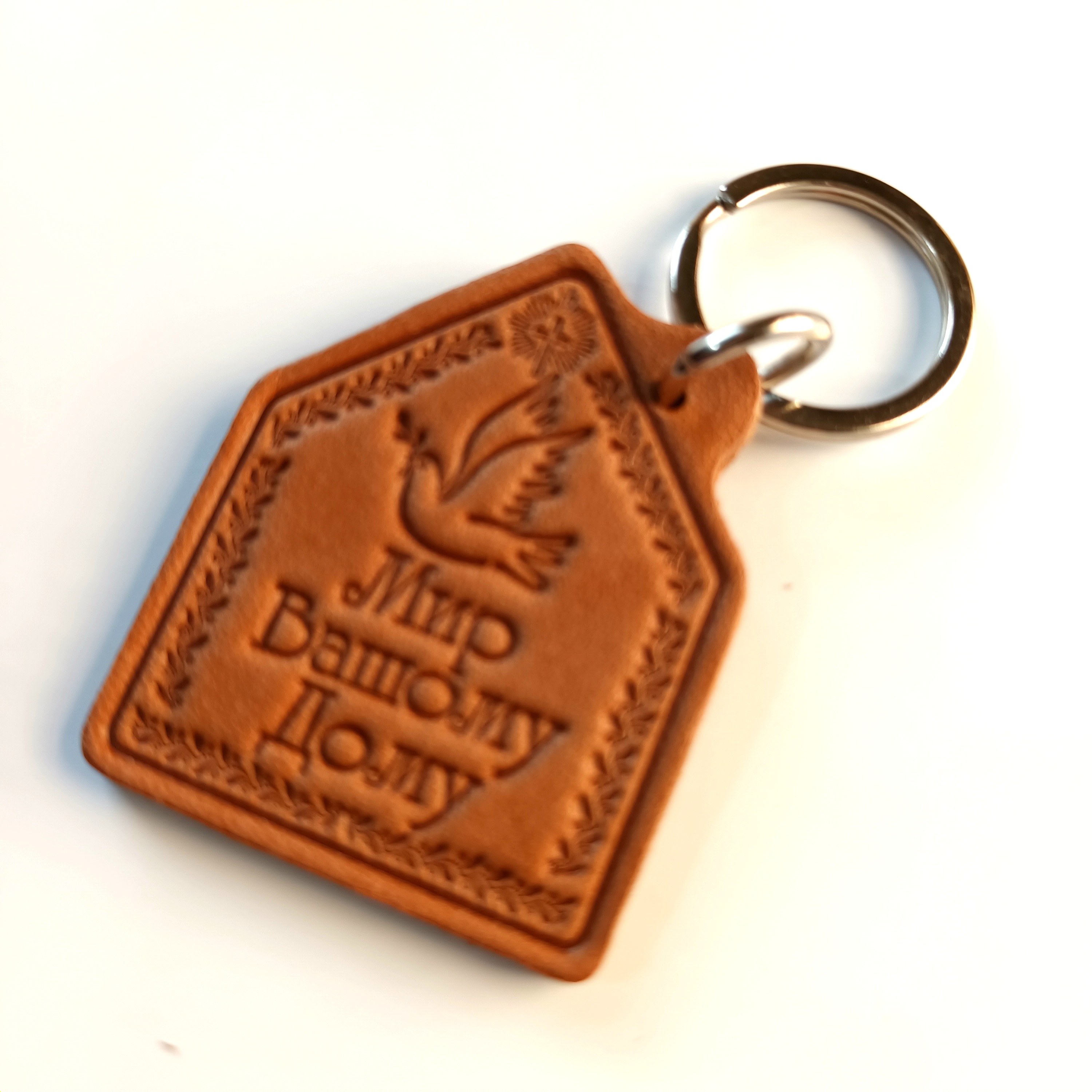 Product Summary Брелок з натуральної шкіри та металевим кілечком. Напис нанесений тисненням. Мова: українська.