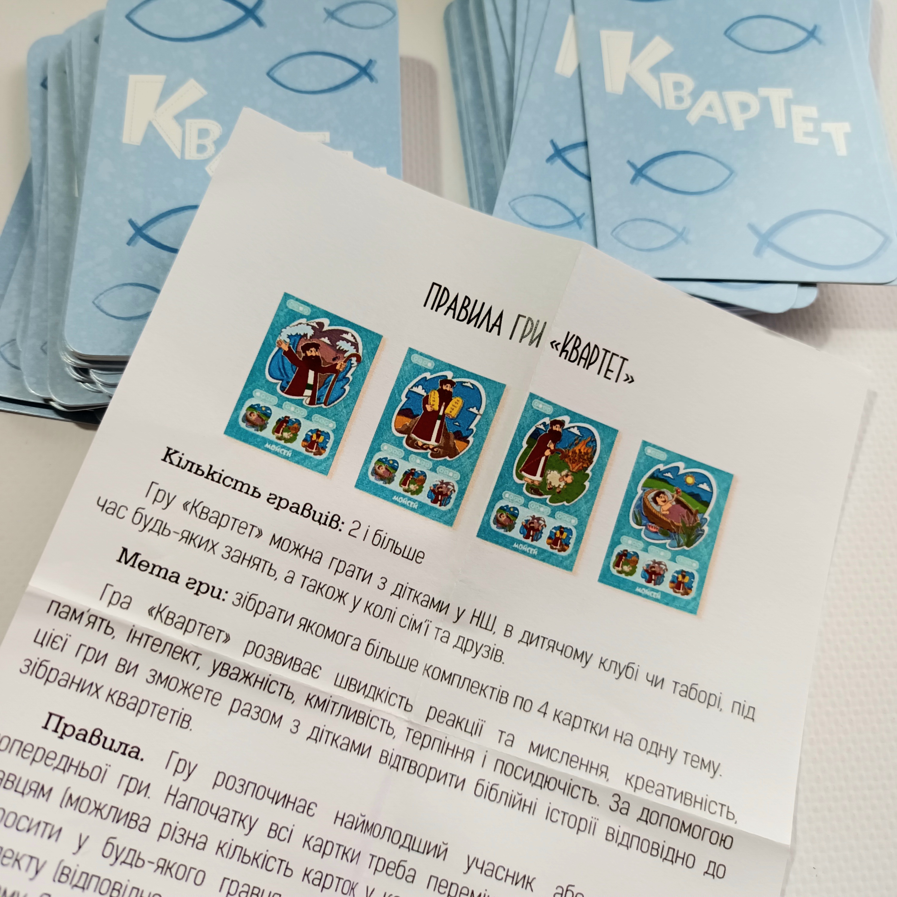 Квартет - це християнська гра, яка розвиває швидкість реакції та мислення, креативність, пам’ять, інтелект, увагу, кмітливість, терпіння і посидучість.Та найголовніше - вона знайомить учасників з бібліними історіями, які вони можуть відтворити відповідно до зібраних квартетів.