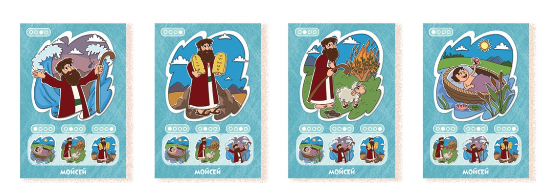 Наповнення: 96 карток, 24 біблійні історії, лист з описом правил гри.
