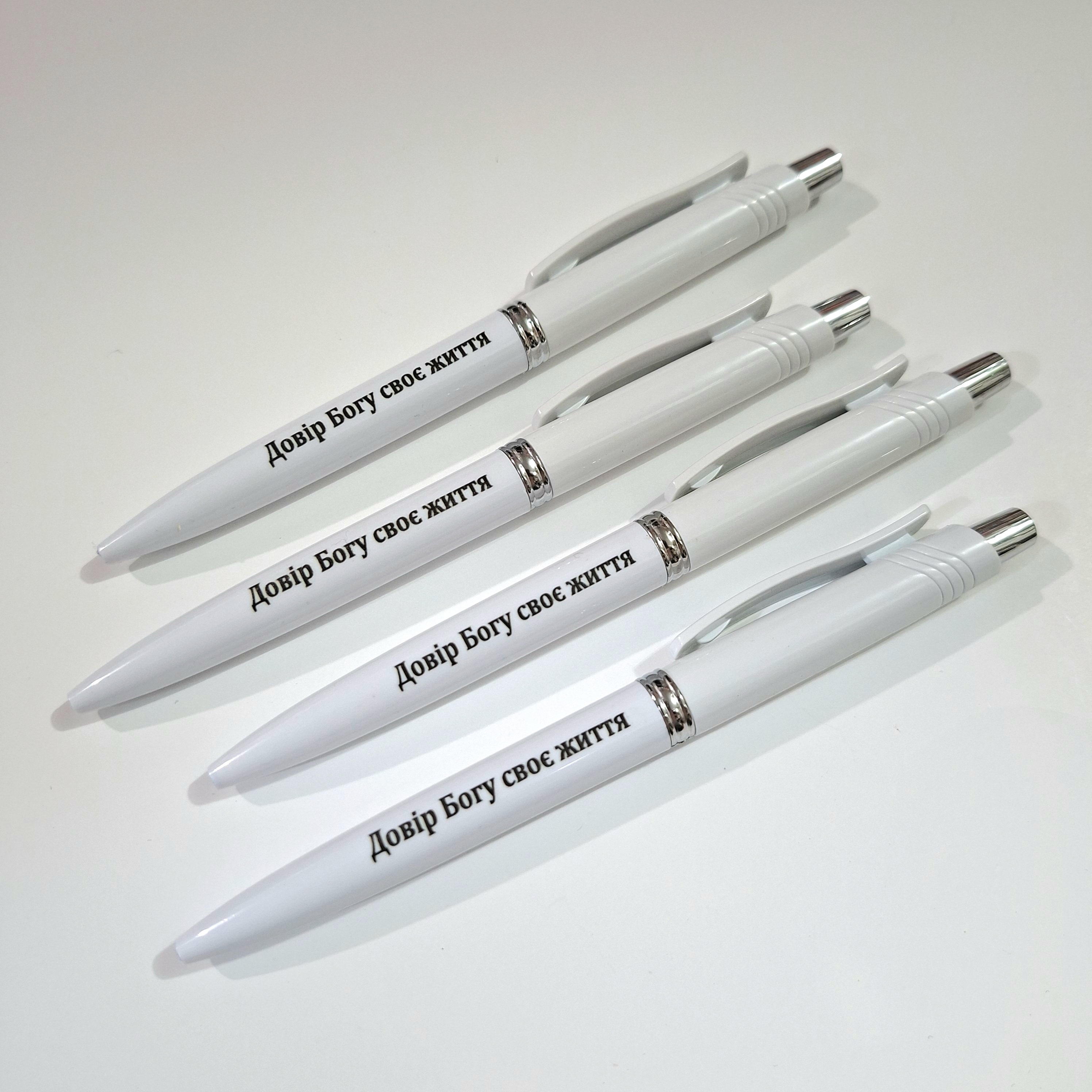 Кулькова ручка в білому корпусі з написом: Довір Богу своє життя! Паста синього кольору.