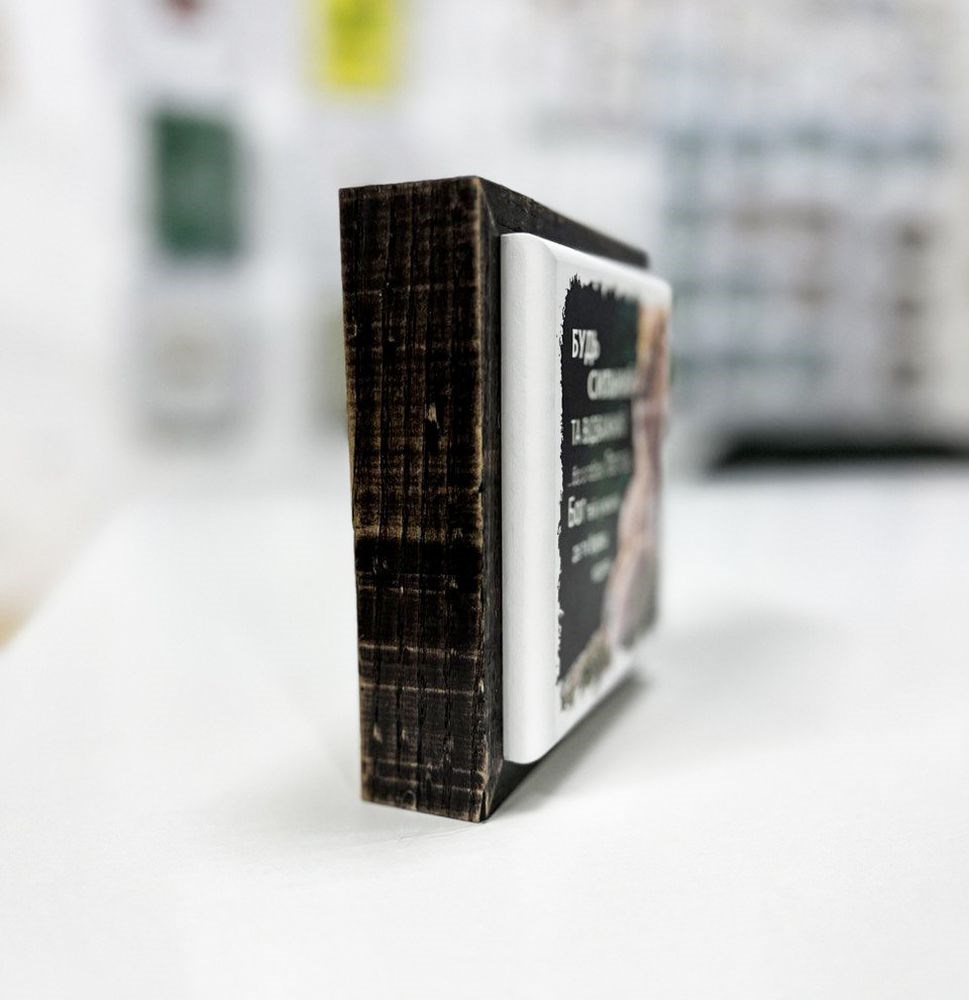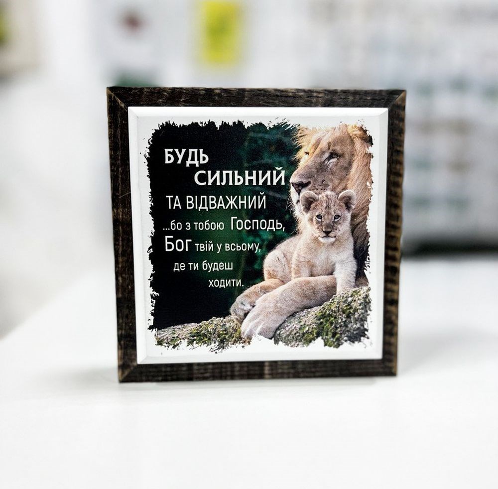 Картина настільна з дерев'яною рамою виконана з масиву дерева. Ширина рамки - 3 см. Розмір зображення - 10,5х10,5 см. Загальним розмір картини - 13х13 см. Висота плитки, на якій нанесено друк - 1 см. Зображення нанесено на плівці методом УФ друку (стійке до УФ променів).