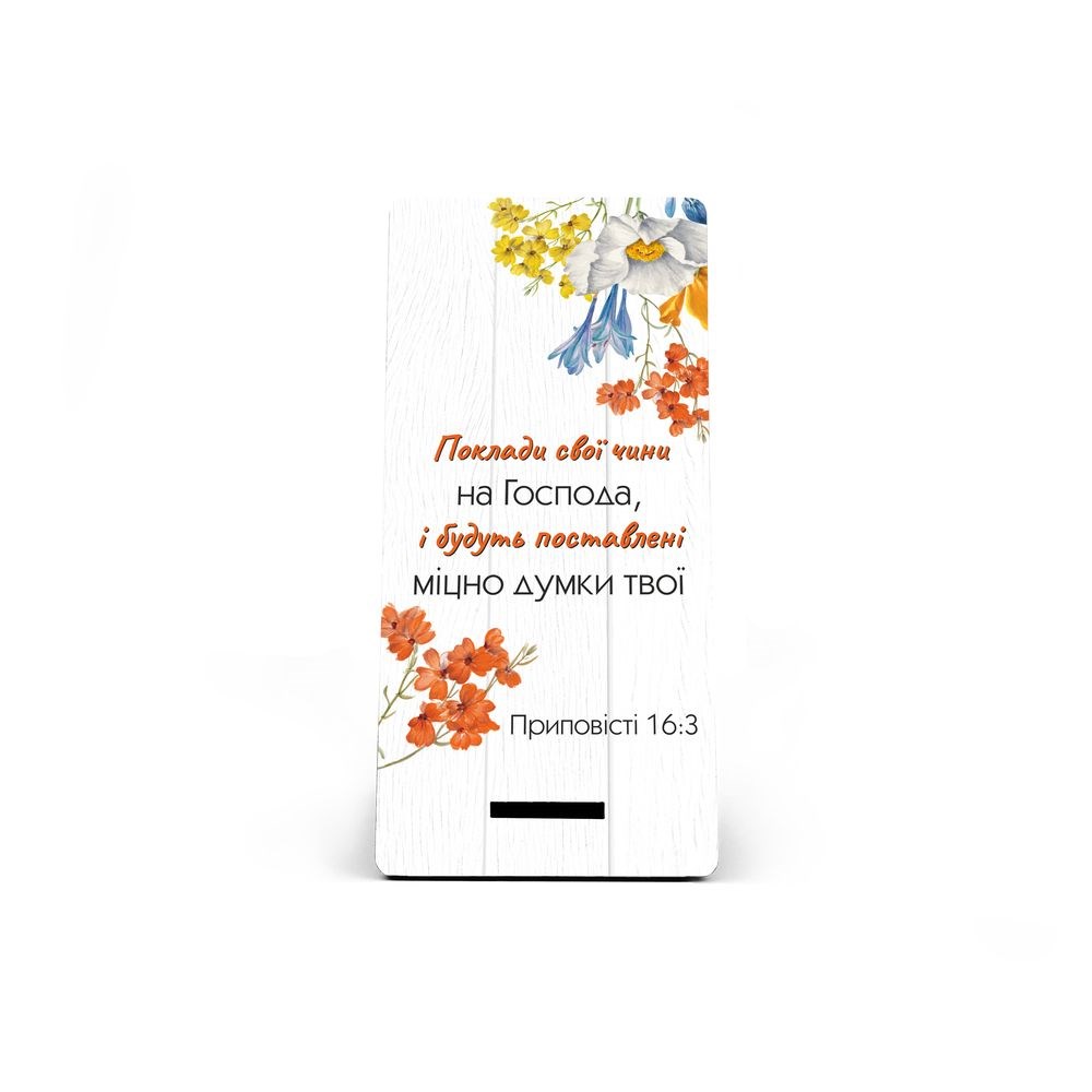 Декоративна табличка з мотивуючими написами та цитатами з Біблії стане доречним подарунком або ж родзинкою Вашого інтер'єру. Просто відламайте нижню частину таблички та вставте її в спеціальний отвір зі зворотнього боку. Табличку можна поставити на будь-яку поверхню. Розмір – 7,5х15 см. Матеріал – ХДФ. УФ-друк