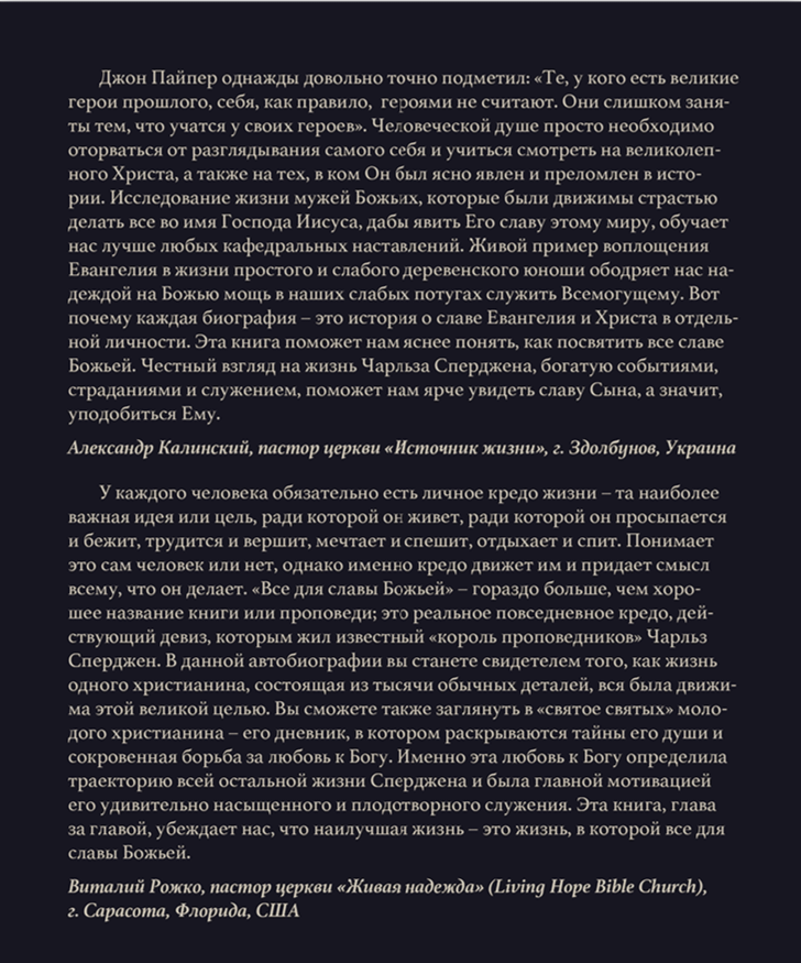 В данной автобиографии, которая была составлена женой Сперджена и его личным секретарем из записей его дневника, писем и проповедей, Ч. Г. Сперджен предстает перед читателем как благовестник, на проповеди которого стекались массы народа, как основатель школы проповедников и сиротского приюта, а также как воинствующий богослов и писатель, книги которого уже давно относятся к классике христианской литературы.