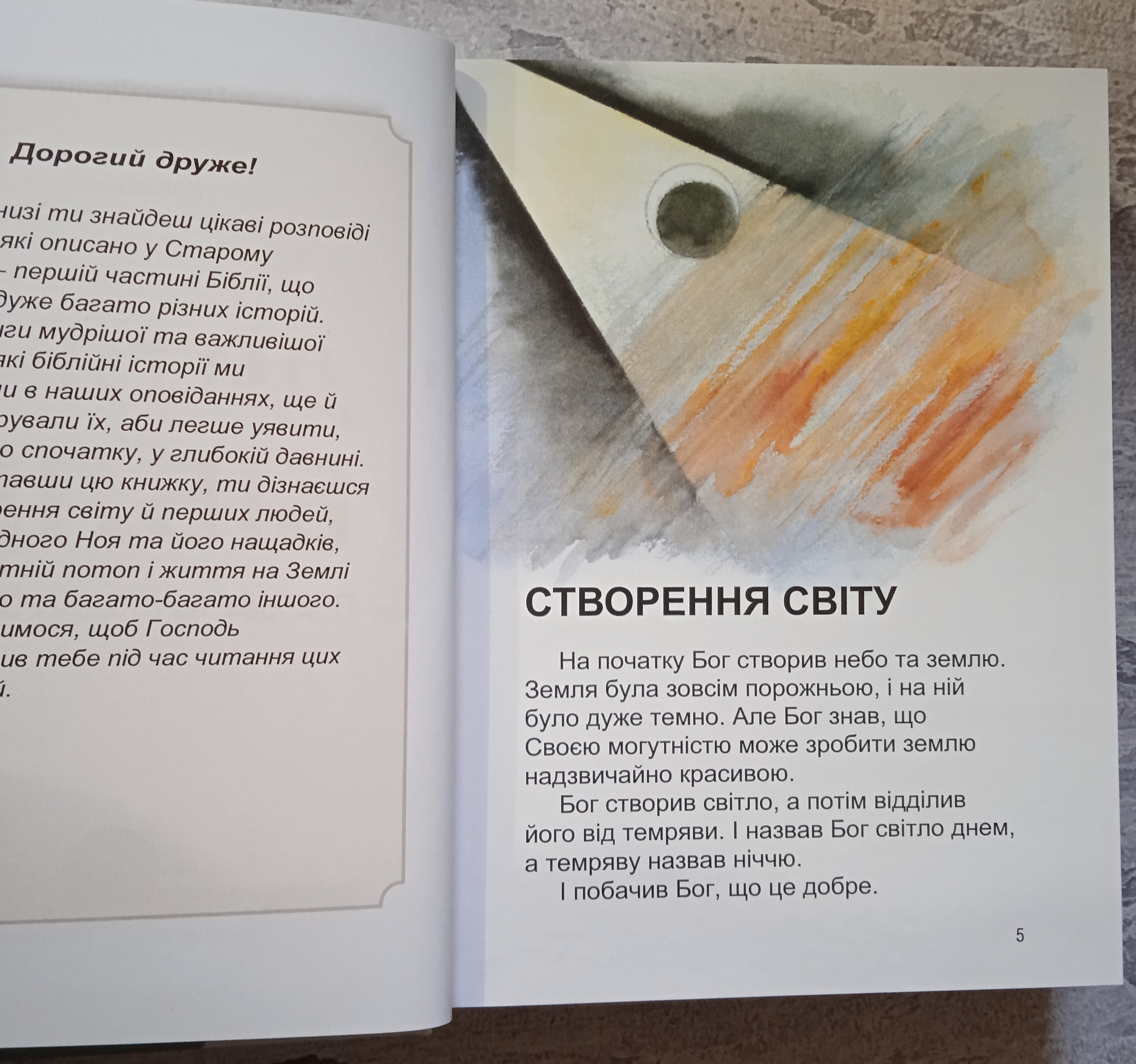 Дорогий друже! У цій книзі ти знайдеш цікаві розповіді про події, які описано у Старому Заповіті – першій частині Біблії, що містить дуже багато різних історій. Немає книги мудрішої та важливішої за цю. Деякі біблійні історії ми переказали в наших оповіданнях, ще й проілюстрували їх, аби легше уявити, як усе було спочатку, у глибокій давнині. Прочитавши цю книжку, ти дізнаєшся про створення світу й перших людей, про праведного Ноя та його нащадків, про всесвітній потоп і життя на Землі після нього та багато-багато іншого.