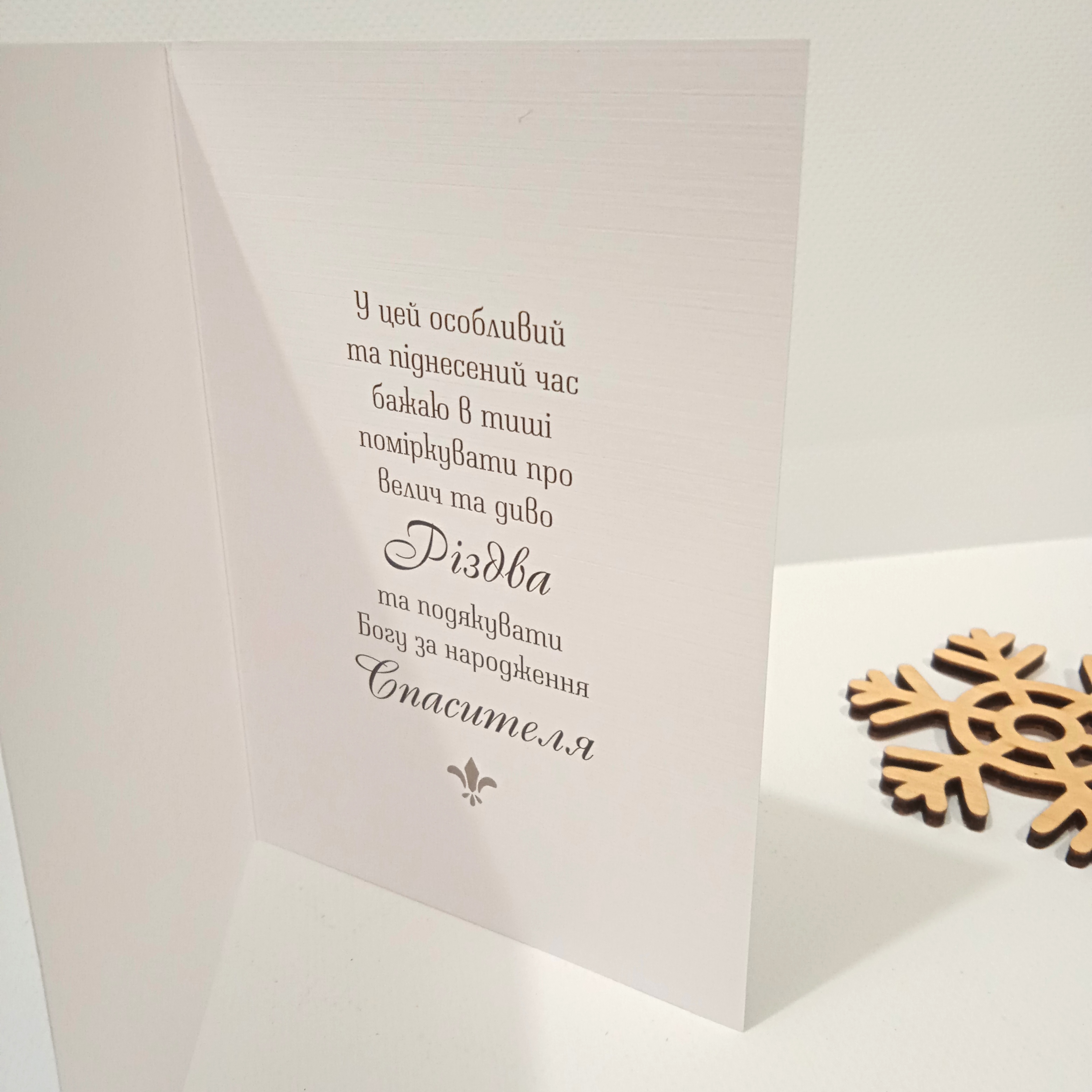 Тематична різдвяна листівка українською мовою. Подвійна. Текст в середині: "У цей особливий та піднесений час бажаю в тиші поміркувати про Велич та диво Різдва та подякувати Богу за народження Спасителя". Розмір в складеному вигляді 105х150мм.