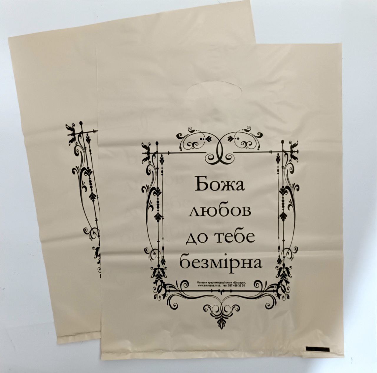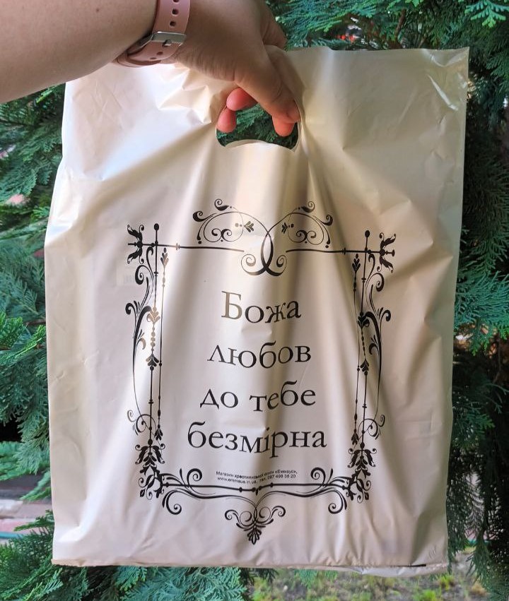 Пакет п/е з написом "Божа любов до тебе безмірна" стане гарним доповненням до подарунку.