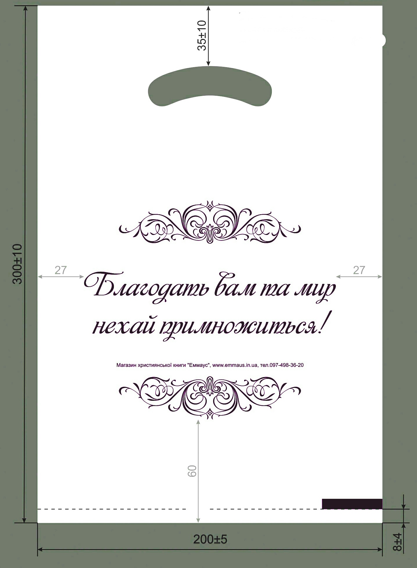 Product Summary Виріб самого меншого Розміру, а саме 300х200 мм. Напис на одній стороні пакетика: Благодать Вам і мир нехай примножаться. Колір пакета білий, текст нанесений чорним кольором. Форма прямокутна.