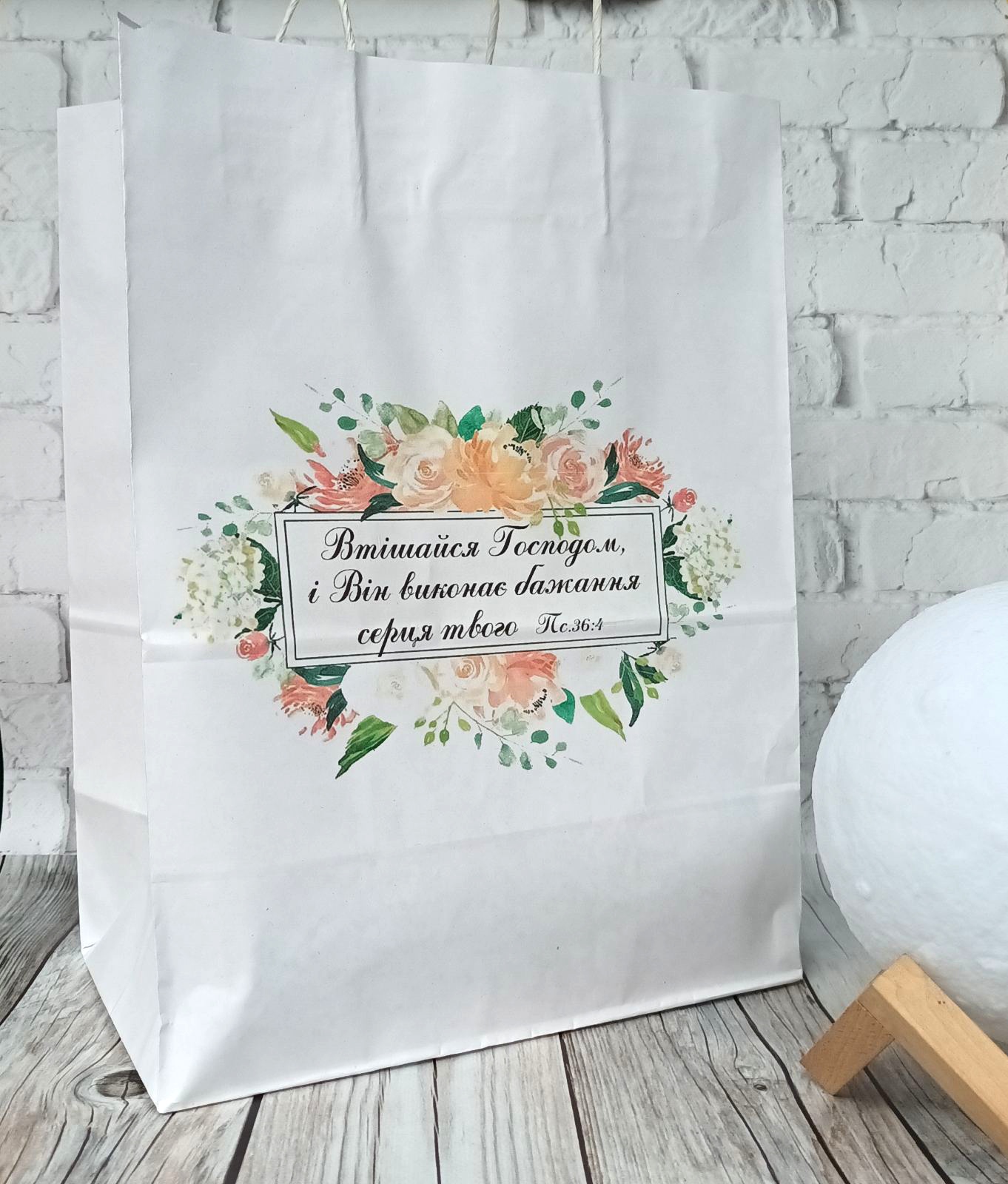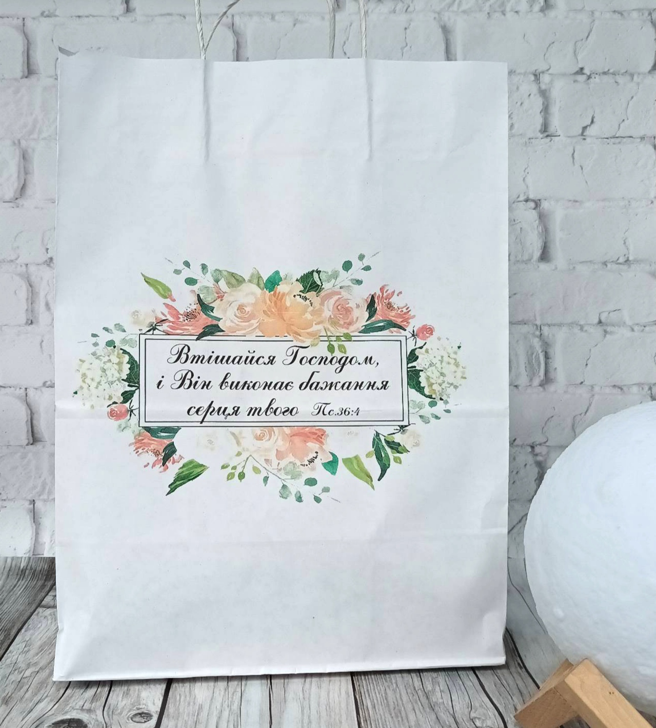Product Summary Паперові Еко-пакетики - новинка в нашому асортименті. Білі крафтові пакетики з ручкою. З однієї сторони дуже гарний квітковий принт з текстом: "ВТІШАЙСЯ ГОСПОДОМ і Він виконає бажання серця твого". Розмір 26х35х15см.