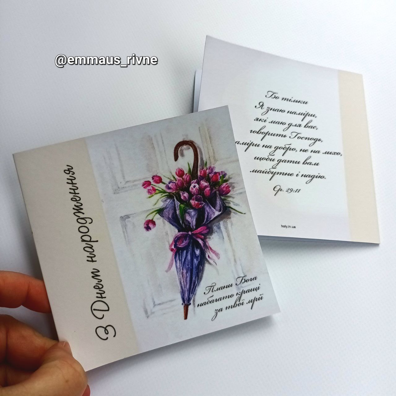 Подвійна листівка з написом українською мовою: "З днем народження. Плани Бога набагато кращі ніж твої".