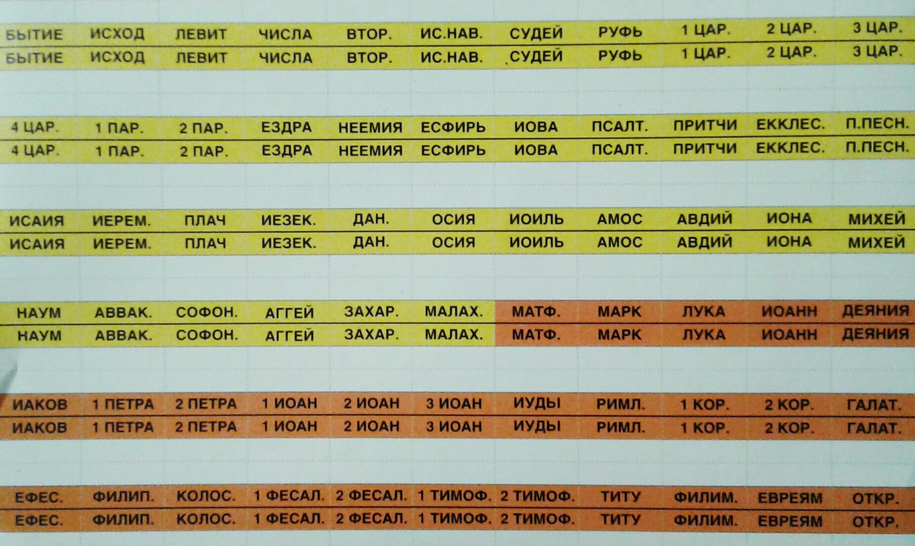Індекси пошукові російською мовою. Не прорізані (потрібно вирізати кожну назву книги). Розраховано на книги Старого та Нового Заповіту, тільки на канонічні книги. Виконано двох кольорах, щоб розділити ЗАПОВІТИ. Текст нанесений чорним кольором. Розмір 205х125мм.