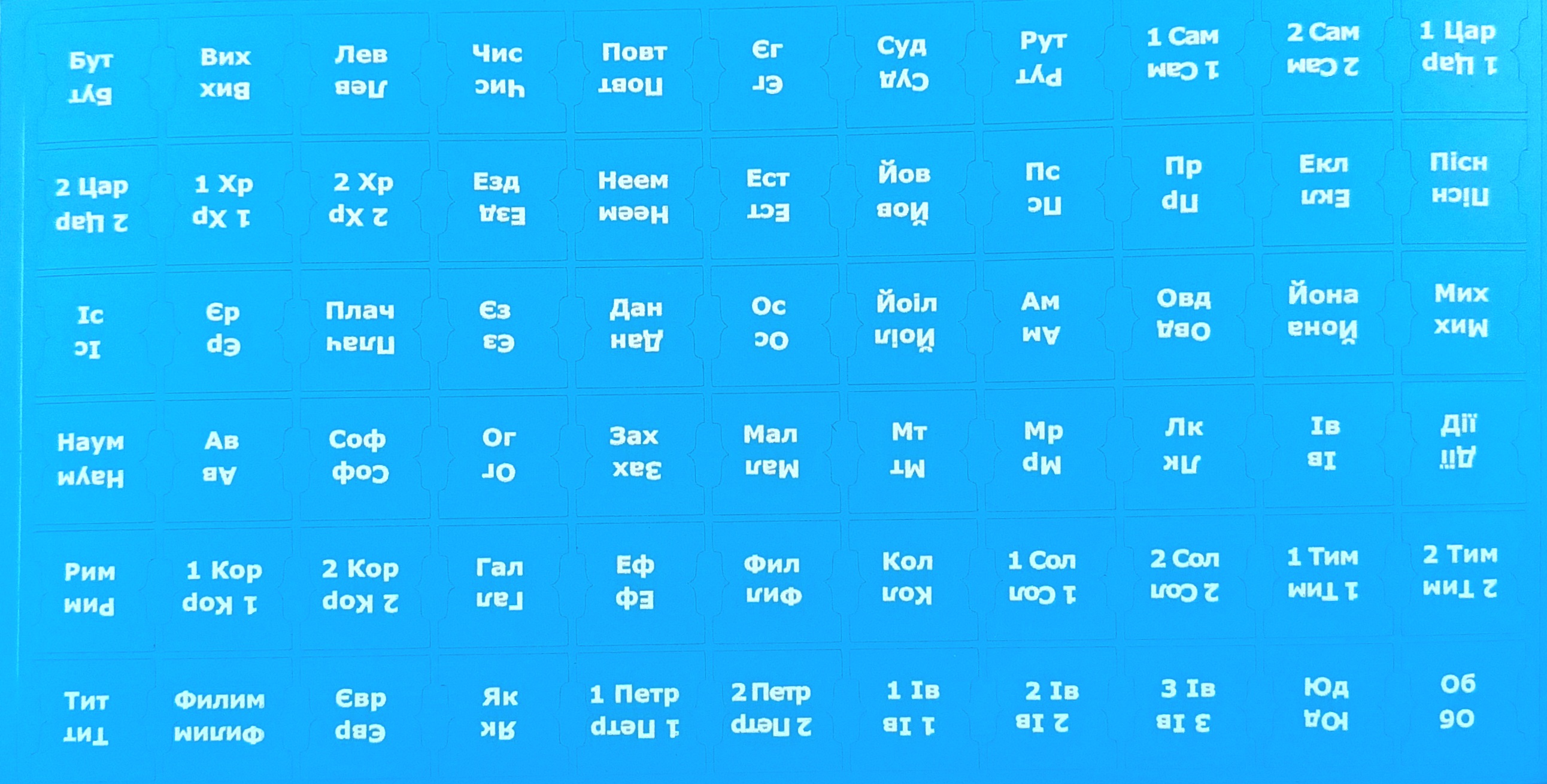 Пошукові індекси блакитного кольору. На книги Старого та Нового Завіт, канонічні. Клейка основа, прорізані. Текст нанесений білим кольором. Розмір листа 205х110мм. Українська мова.